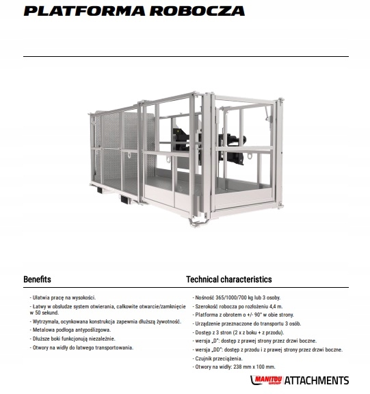 Платформа обладнана 3 точками входу з трьох різних сторін. Датчики протиковзання підлоги та перевантаження підвищують безпеку експлуатації. Кошик можна повертати на 90 градусів, що збільшує його корисність і обсяг робіт, які можна з ним виконувати.