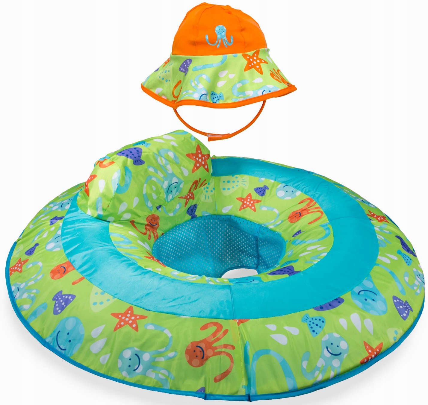 Кільце SwimWays Baby Springfloat виготовлено компанією Spin Master, відомою своєю високоякісною продукцією. Понтон має сидіння з сітки з отворами для ніжок і спинку, що забезпечить комфорт дитини. Він зеленого та помаранчевого кольорів і має зображення, пов’язані з морськими істотами. Крім того, капелюх додається для захисту від сонця.