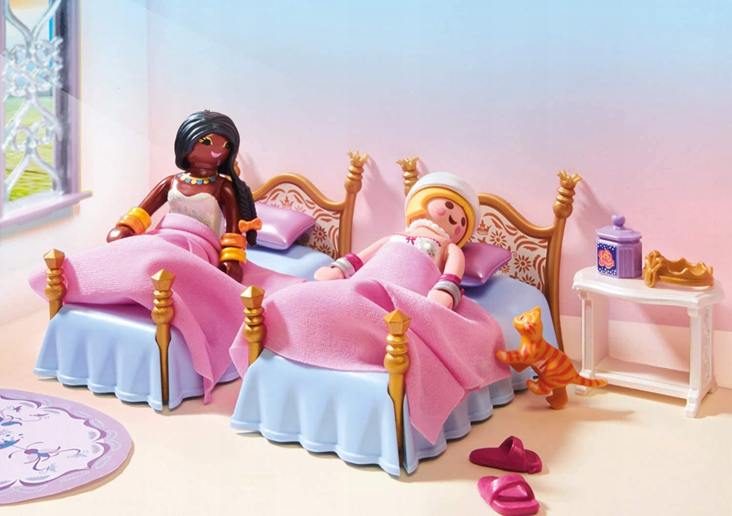 Принцеси також повинні спати. Розкішна спальня пропонує багато місця для відпочинку та щасливих снів. Принцеса Бінту сидить перед дзеркалом макіяжу, він розчісує чорне волосся і думає про те, який одяг вона може спроектувати. Її найбільша мрія - стати модельєром. Однак він дуже геніальний і часто використовує старий одяг, щоб створити щось нове. Тепер він лягає спати, обіймає м'яку подушку та мрії про велику колекцію моди. Кошеня стрибає на коліна і складається на руках. Спати добре, Бінту. Комплект включає двох персонажів Playmobil, принцеса Бінту з Африки та інша принцеса, два ліжка з подушками та ковдрами, свічник, туалетний столик з дзеркалом та табуретом та іншими аксесуарами.