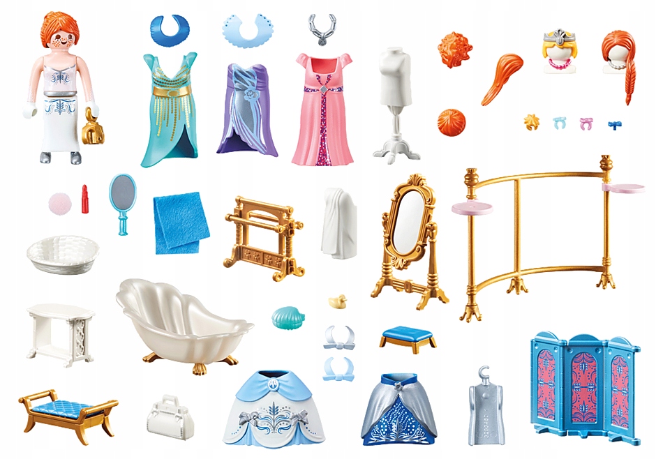 Частиною королівського етикету є, звичайно, відповідний одяг для будь-якого випадку. Тому принцеси проводять багато часу в гримерці. Вибирають сукні та аксесуари, обговорюють зачіски та макіяж. Спортивна принцеса Саллі любить комфорт, а також елегантність. Оскільки вона любить бути в центрі уваги, їй подобаються сукні, які виблискують і сяють. Зараз він поєднується з біло-блакитною сукнею зі срібними прикрасами. Це саме те, що підходить для м'яча. Тепер не вистачає лише відповідних аксесуарів, але стильна Саллі точно знайде щось гарне. Набір складається з фігурки Playmobil, принцеси Саллі з Австралії, ванни з черепашкою, складної ширми, рейок з вішалками для одягу та одягу, макіяжу з дзеркалом та диваном та багатьох інших аксесуарів для укладання.