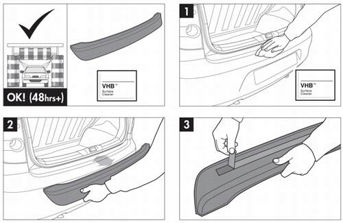 Ретельно очистіть і висушіть поверхню бампера, потім відірвіть захисну стрічку від смужки і акуратно приклейте її до верхньої частини бампера. Потім смужку потрібно притиснути до бампера.