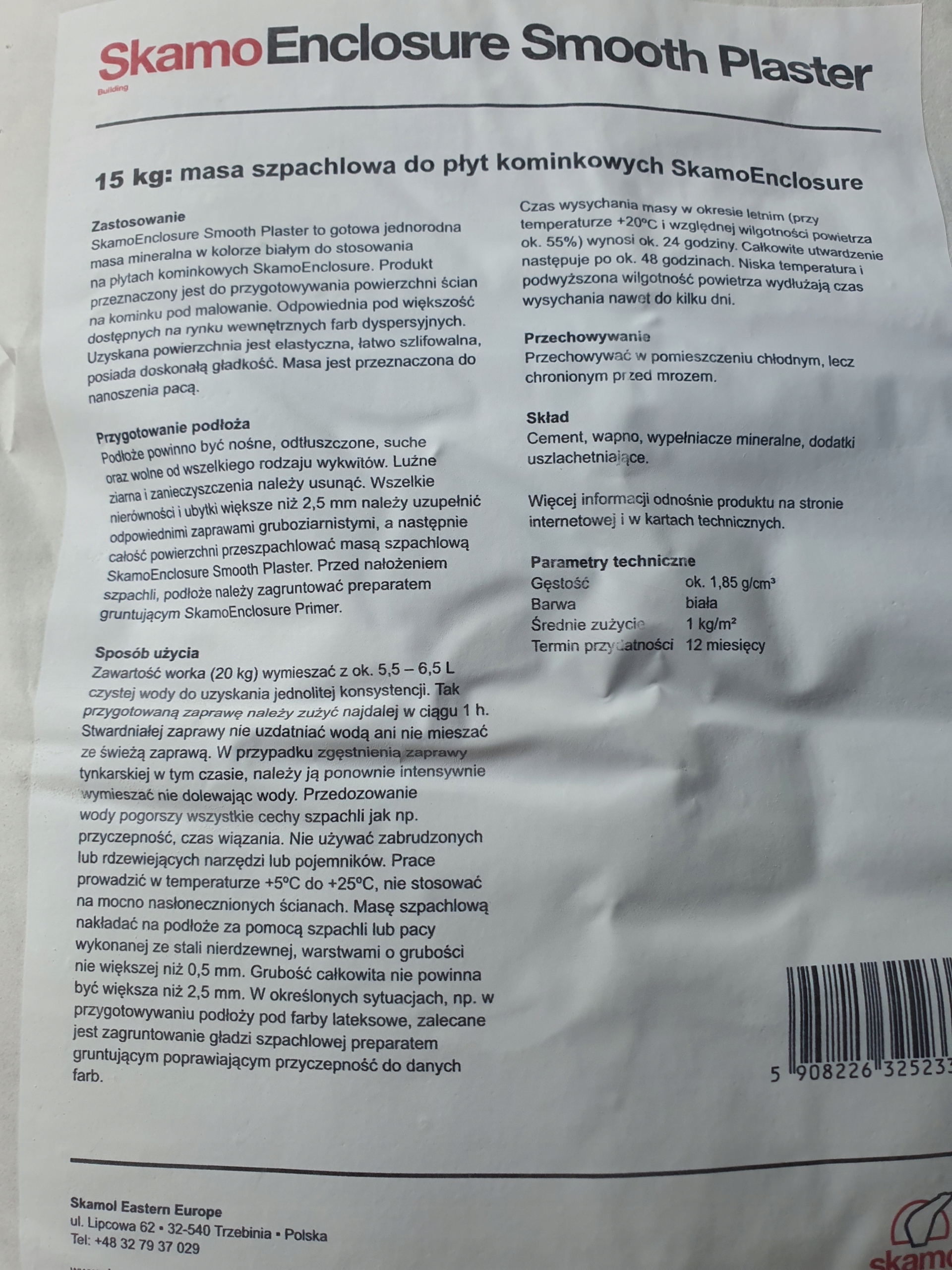 - SkamoEnclosure Smooth Plaster 15 кг х 1 шт. - для фінішної обробки, вирівнювання плити поверхні за межами корпусу каміна