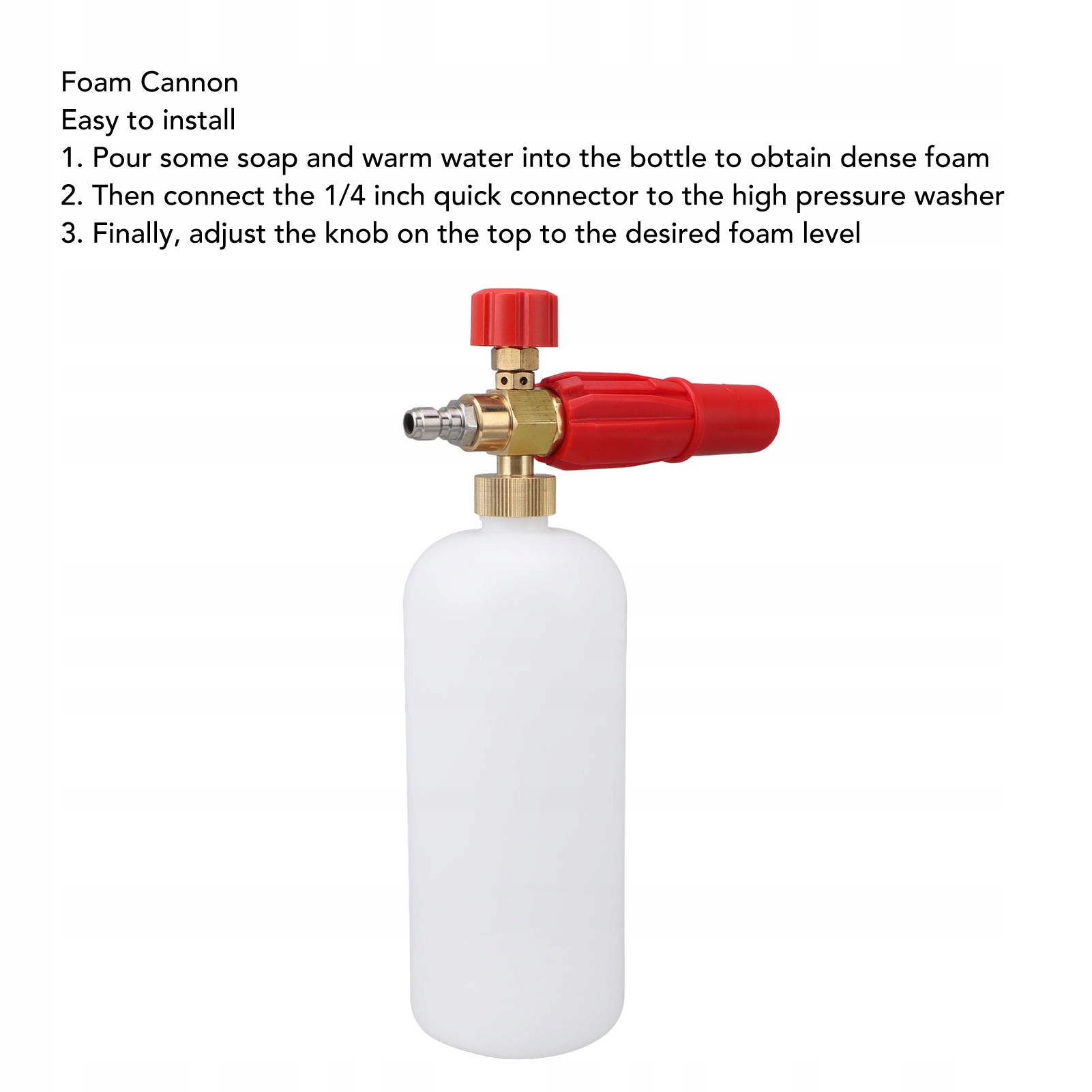 1. Легке встановлення: просто налийте мило та теплу воду в пляшку, щоб утворилася густа піна, а потім під’єднайте штекер швидкого з’єднання 1/4 дюйма до мийки високого тиску (не входить у комплект). Відрегулюйте верхню ручку на потрібний рівень піни, і розпилювач піни видасть густу піну.