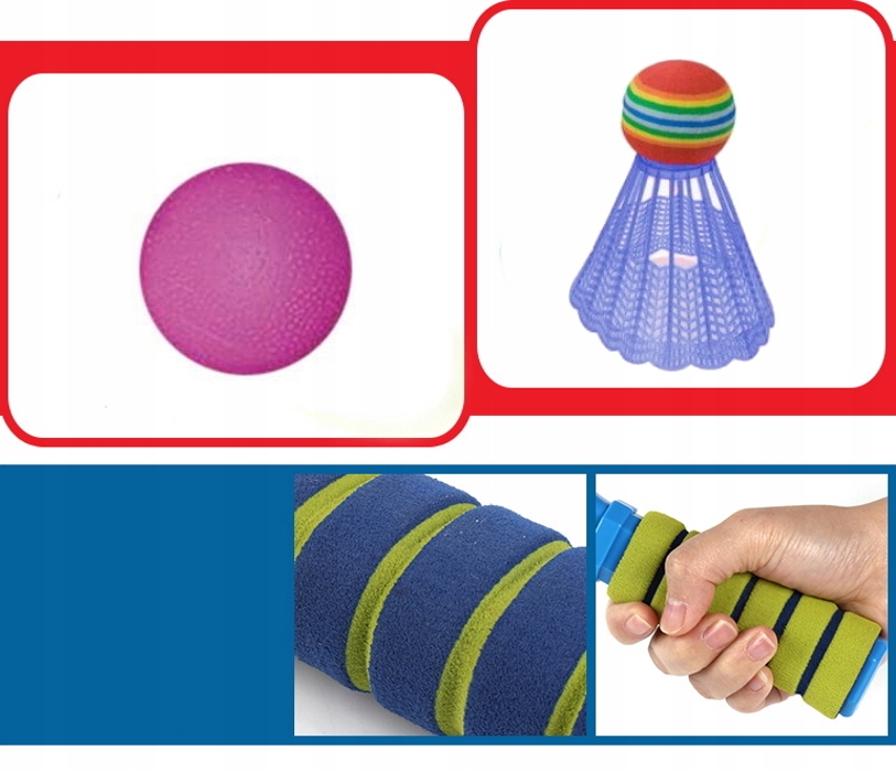 Він складається з двох різнокольорових ракеток із гнучкою сіткою та пінопластовою ручкою, пластикового м’яча та волана.