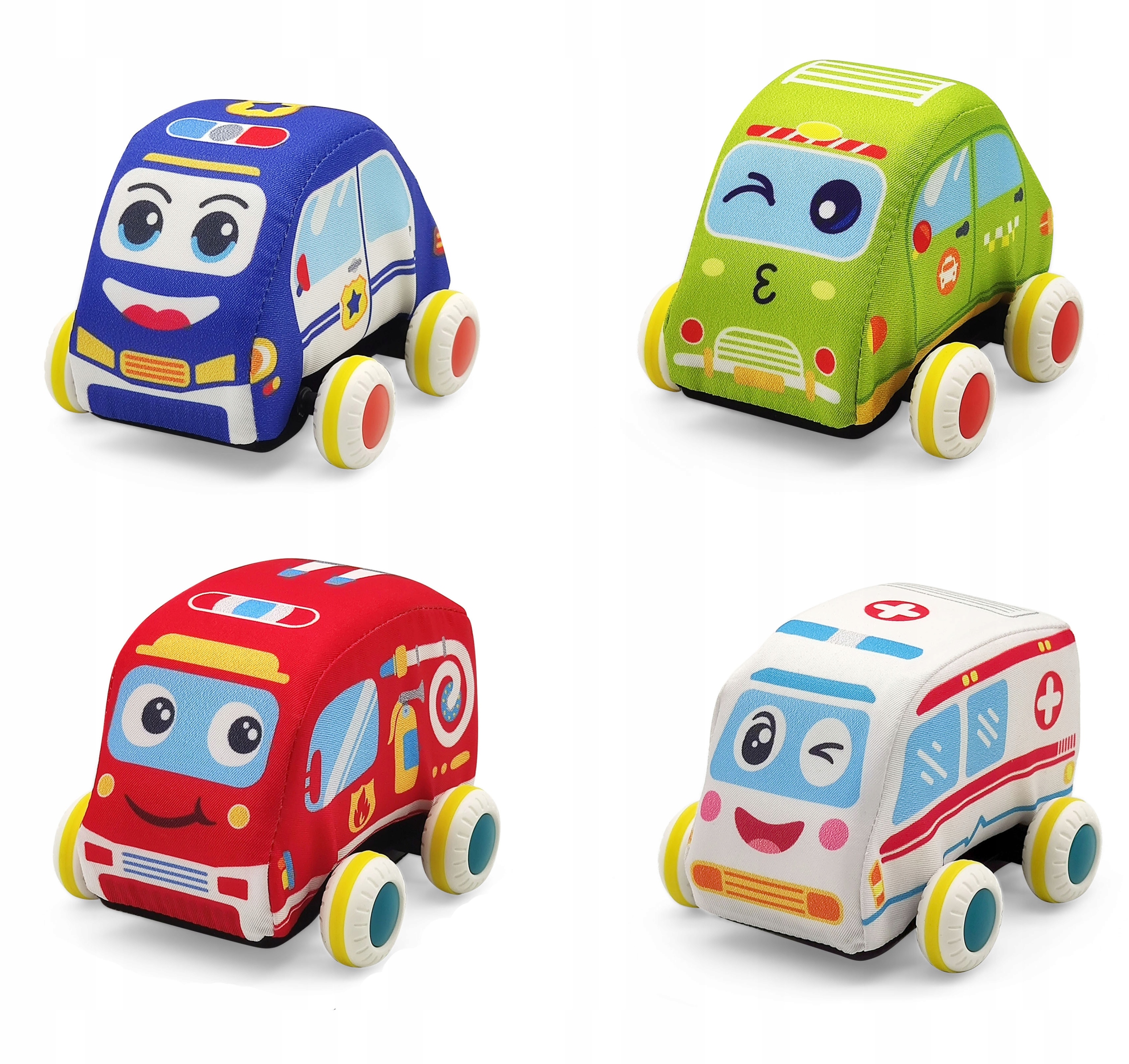 - Це 4 різнокольорові машини в дизайнах, які найбільше подобаються дітям: поліція, пожежна команда, швидка допомога та таксі.