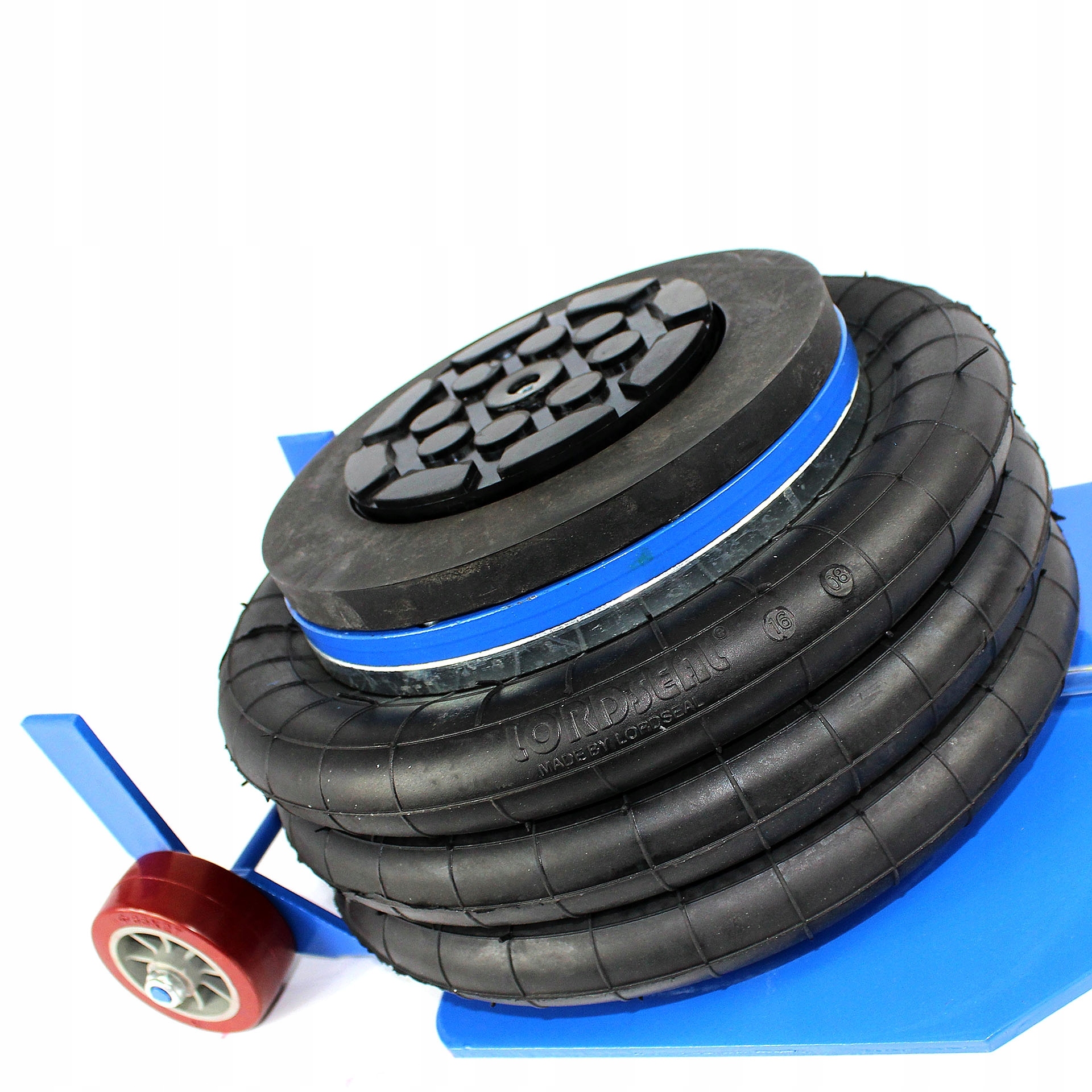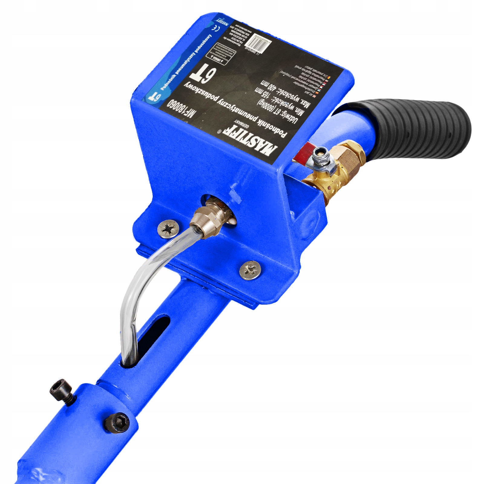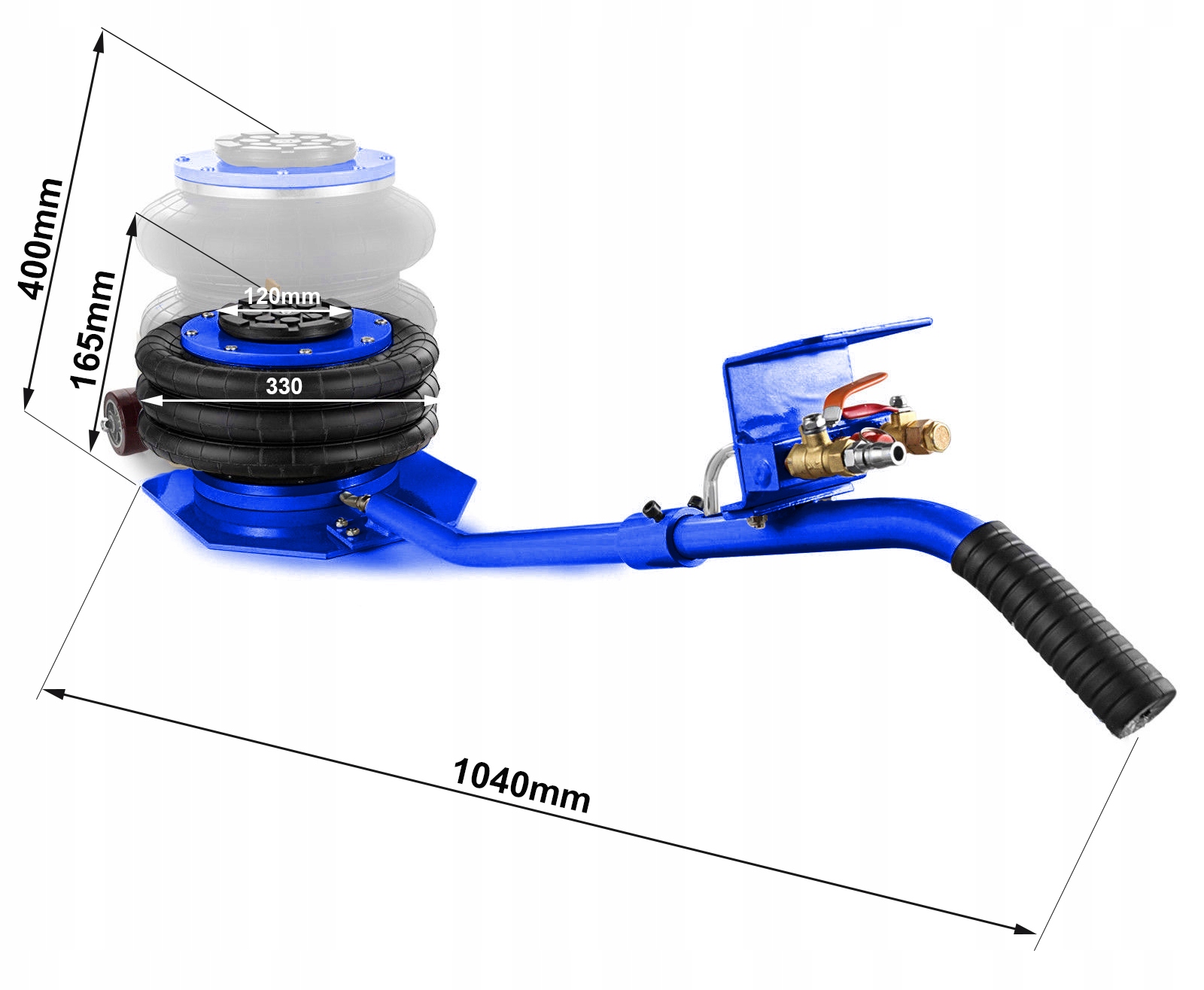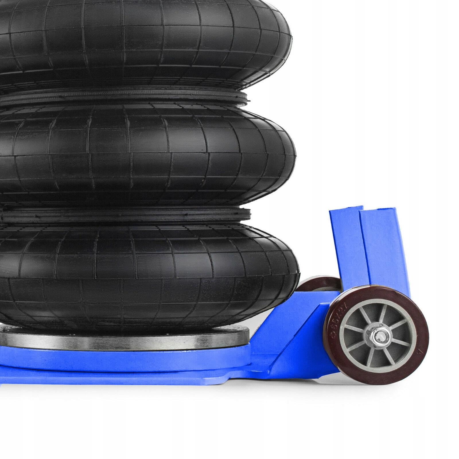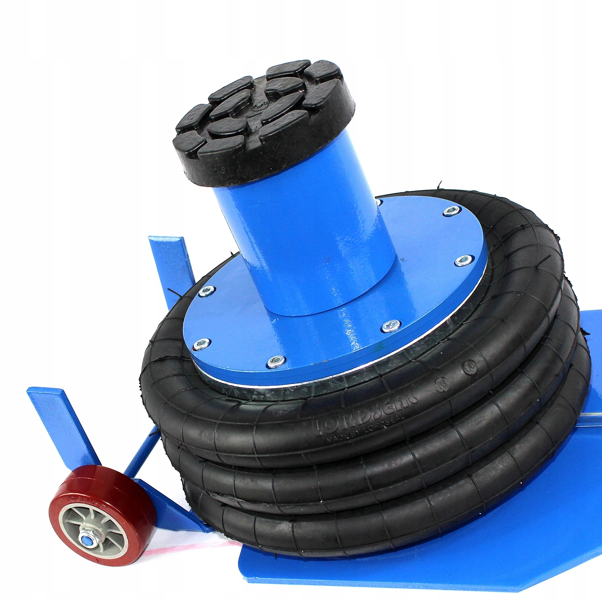 - Підйомник оснащений двома 1/4 кульковими клапанами (входом і виходом), завдяки яким він не впаде навіть після відключення джерела повітря. Більше того, після перевищення дозволеного тиску стисненого повітря, вище 10 бар, запобіжний клапан запобігає розірванню подушки. Ручка полегшує маневрування, в той час як два великі поліуретанові колеса діаметром 65 мм забезпечують комфортну роботу навіть на нерівній поверхні.