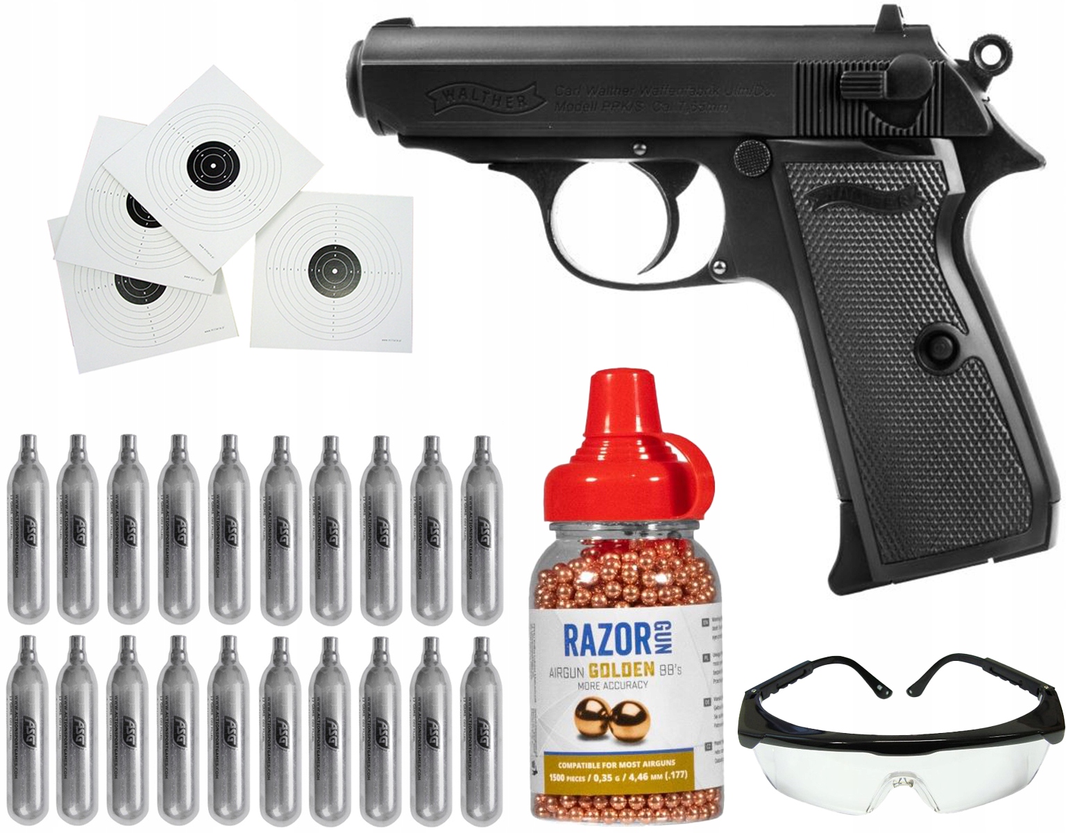 Пневматична зброя Walther PPK/S, 4,5 мм BB, CO2, блоубек, магазин на 20 куль + 20 капсул CO2 + 1500 куль + 10 мішеней + захисні окуляри