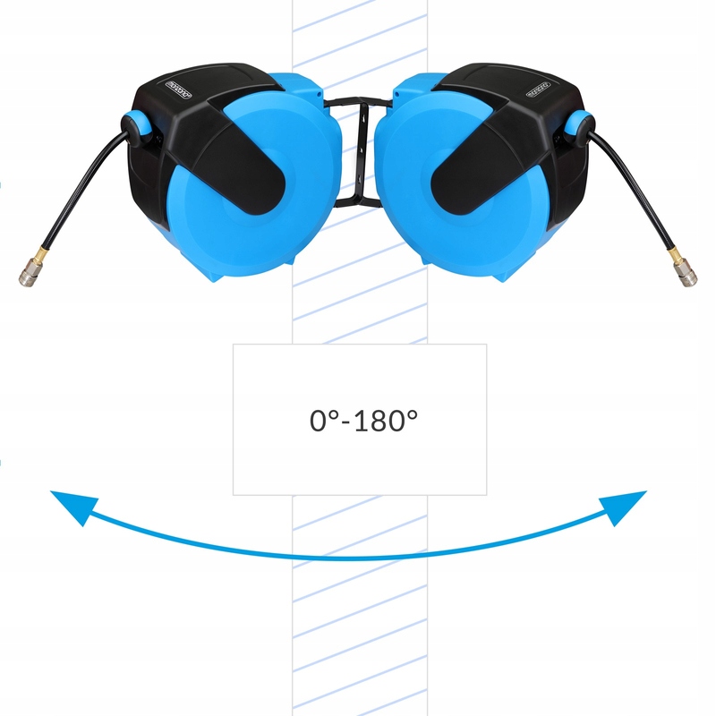 Барабанний шланг зі стисненим повітрям буде підтримувати порядок . Настінне кріплення забезпечує легку установку та гнучке обертання на 180°. Завдяки автоматичному змотування шланг складеться швидко і акуратно. Барабан попередньо зібраний, готовий до використання.
