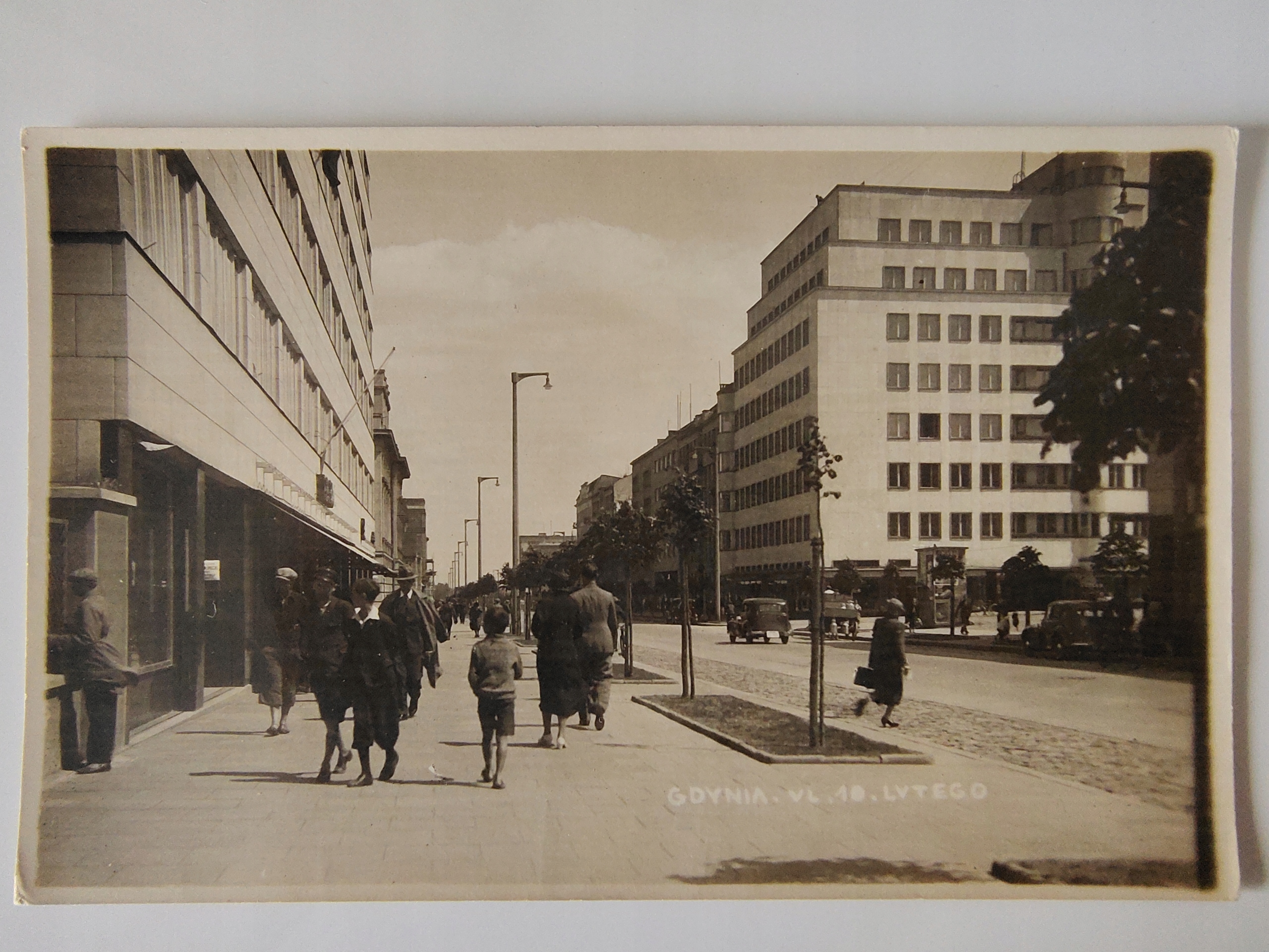 листівка Гдиня ul. 10 лютого, будівлі, люди, машини