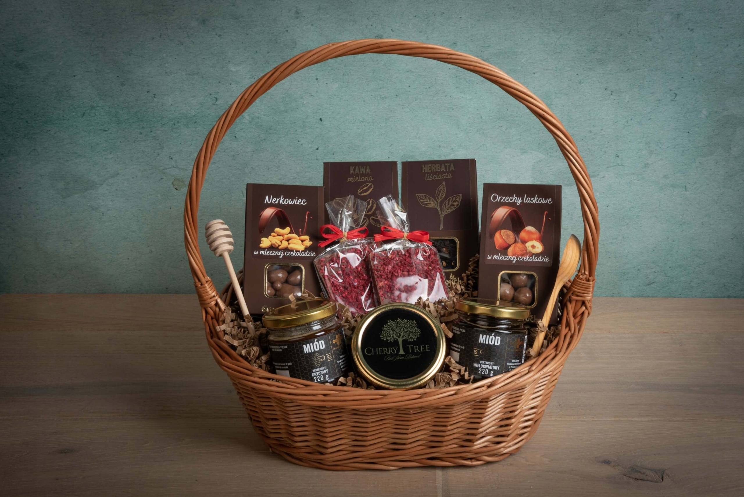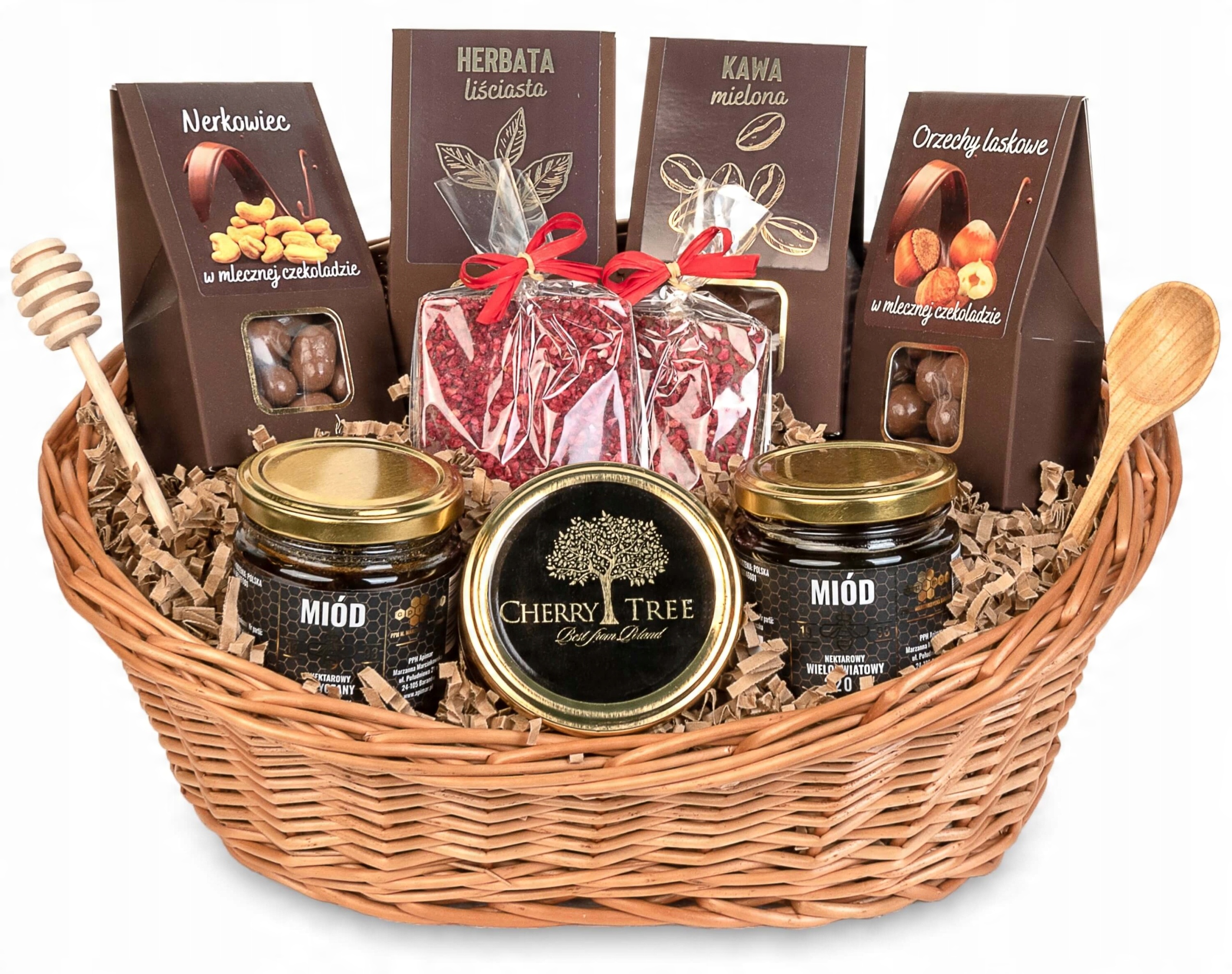 Наш вибраний чай та свіжоземна кава забезпечать моменти відпочинку та задоволення. Смачні горіхи в шоколаді, поліруванні меду та ароматичного варення доповнюються цим кошику. Все це упаковано в елегантний плетений кошик, готовий стати незабутнім подарунком для коханої людини.