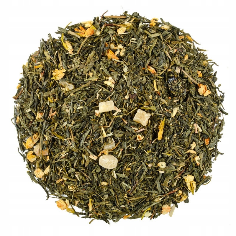 - Інгредієнти: Зелений чай з порохом, сушена апельсинова шкірка, лимонна трава, сушена імбир, сушена базилік, аромат