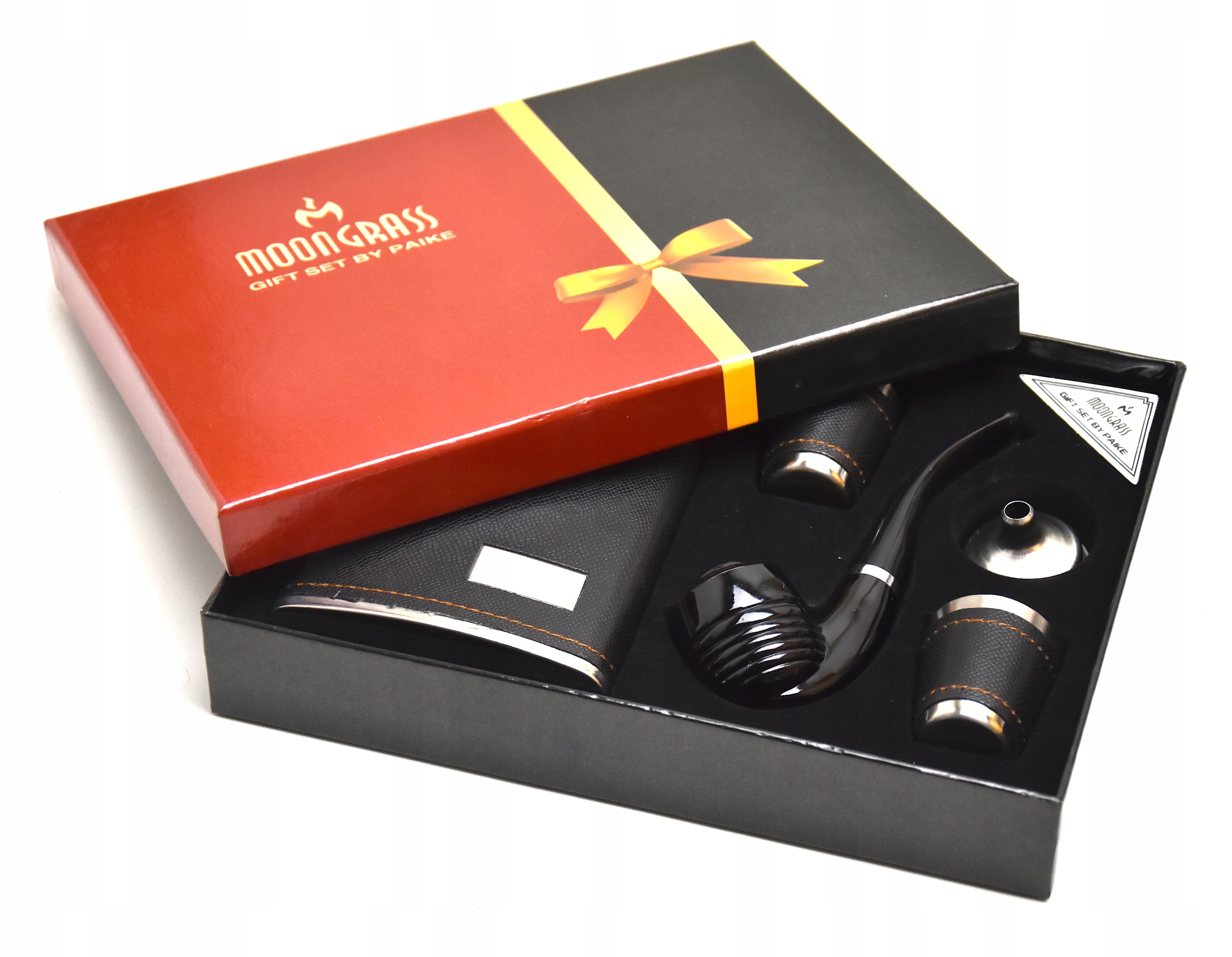 - У набір також входить елегантна люлька для любителів тютюну, люлька виготовлена з міцного матеріалу, оброблена металевою чашею, два келихи з високоякісної нержавіючої сталі також мають чорне покриття, як і фляга