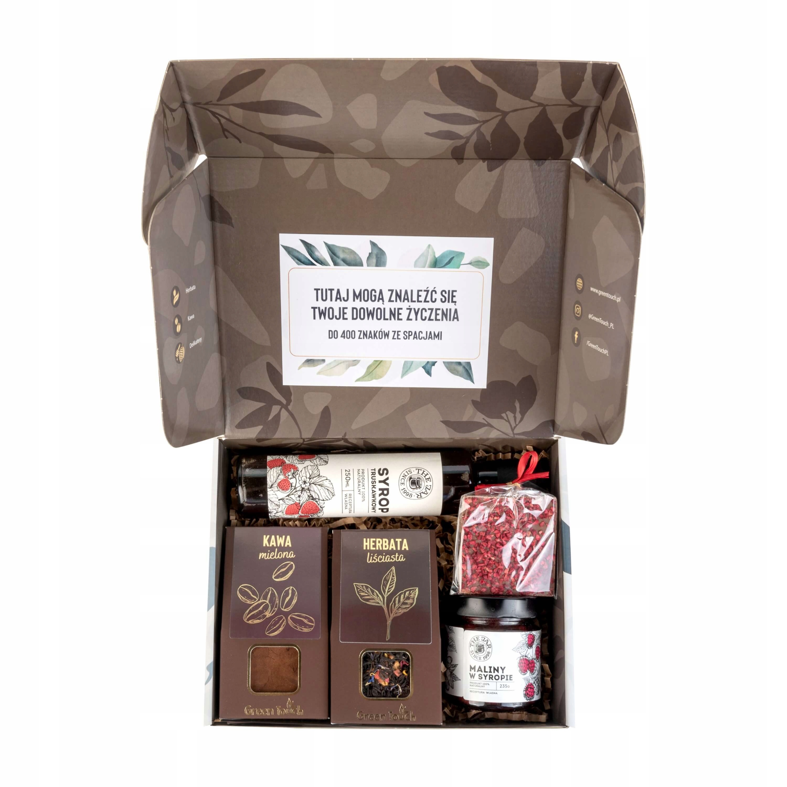 Відкрийте глибину аромату чорного зеленого чаю та унікальності свіжої меленої кави 100% арабіки. Насолода від солодкості натурального полуничного сиропу та малини в сиропі, а шоколадна неаполітанка з замерзними фруктами підкреслить унікальний характер цього подарунка. Ідеальний подарунок для кожного гурману, готовий до передачі!