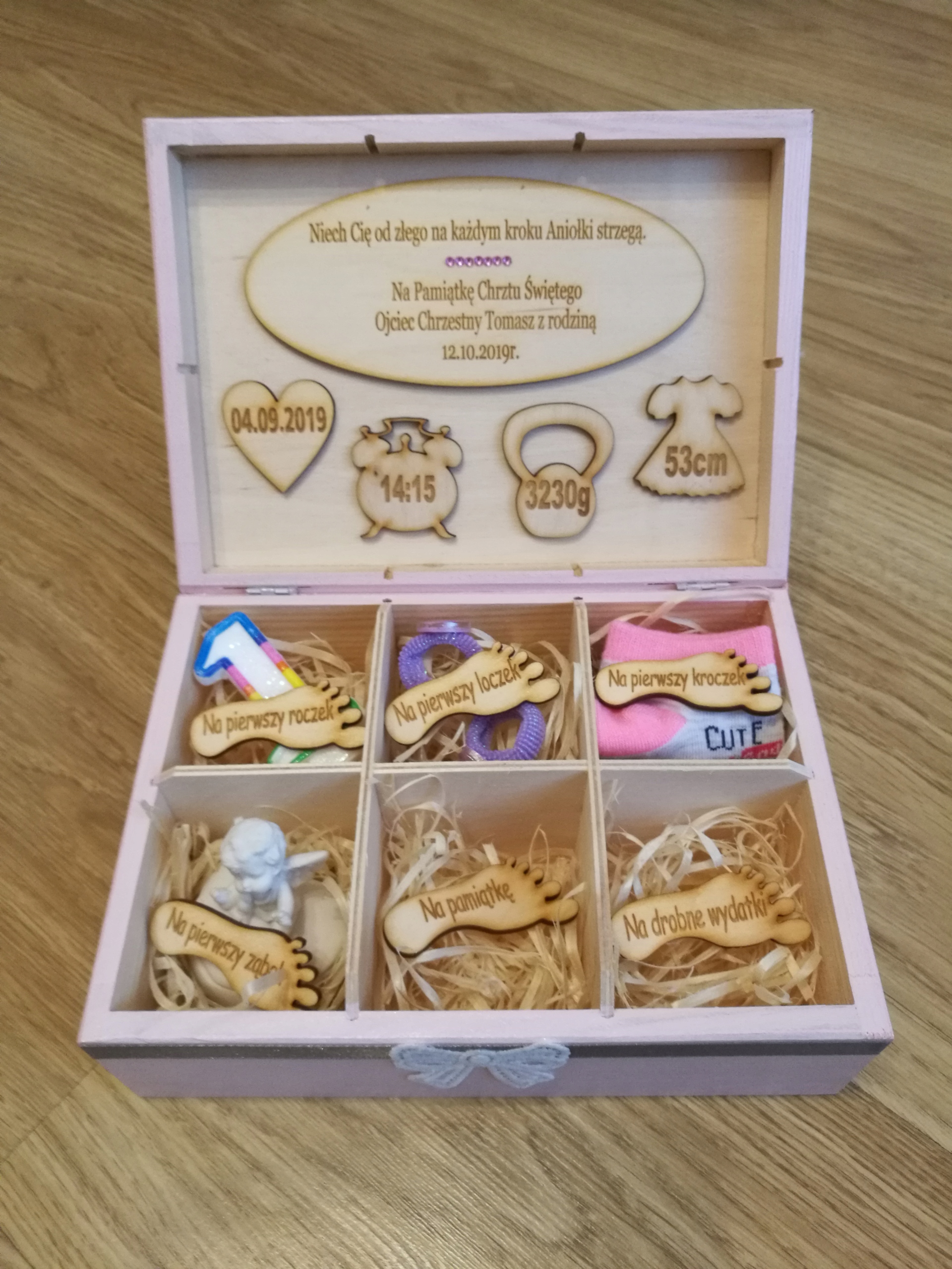 Просматривая «Подарок на крещение коробка для отпечатков на день рождения», вы можете быть уверены, что данный товар из каталога «Остальные» будет доставлен из Польши и проверен на целостность. В цене товара, указанной на сайте, учтена доставка из Польши. Внимание!!! Товары для Евросоюза, согласно законодательству стран Евросоюза, могут отличаться упаковкой или наполнением.