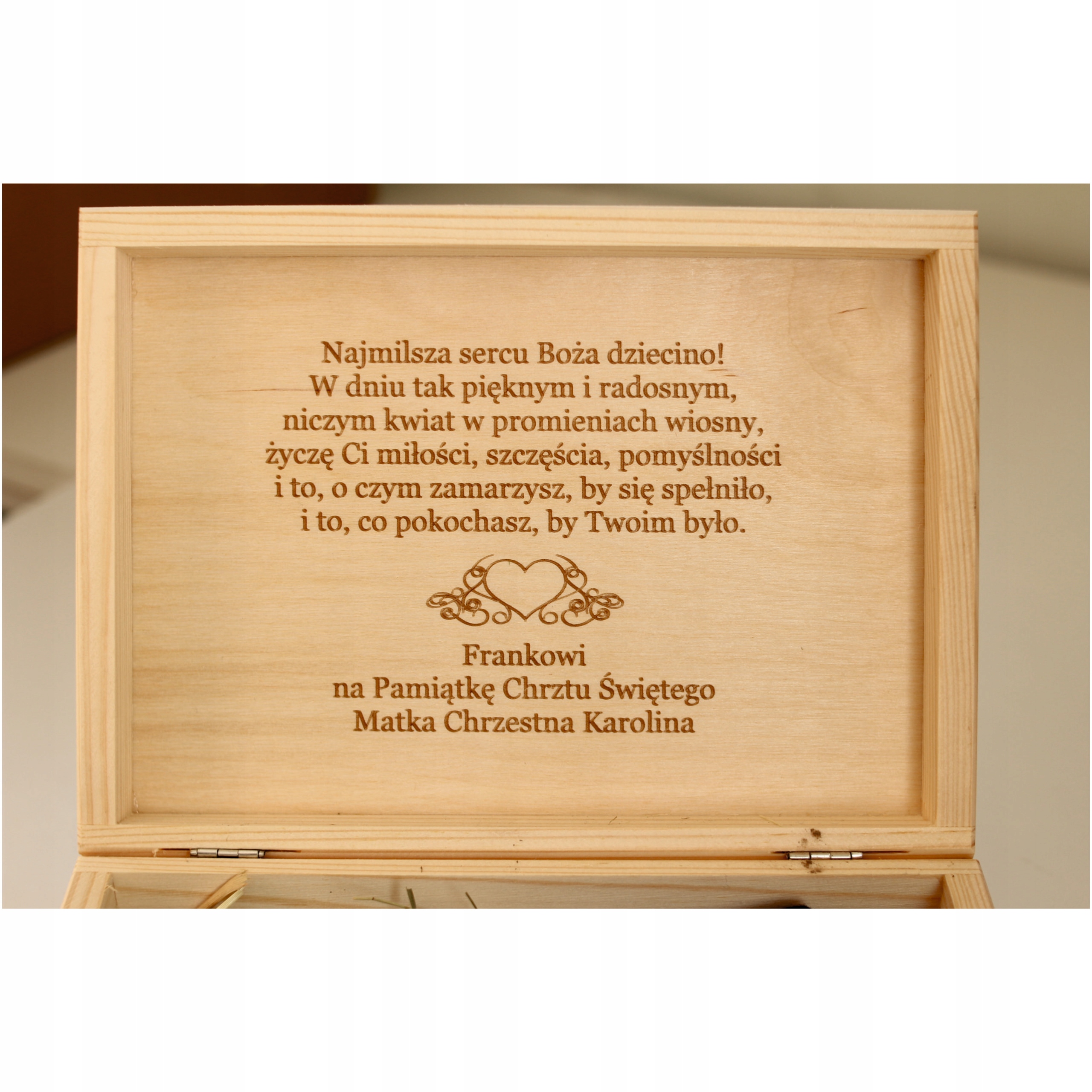 Як відомо, Святе Хрещення є першим важливим таїнством у житті дитини. Чи згодні ви з нами, що сувеніри з цього дня мають бути унікальними та вічними? Ось такий наш дерев'яний ящик. Перш за все, гравірування наноситься лазером, завдяки чому відбиток виходить довговічним і не тьмяніє з роками. По-друге, завдяки гравіруванню шкатулка стає дуже особистим подарунком. Вам потрібен такий подарунок, правда?