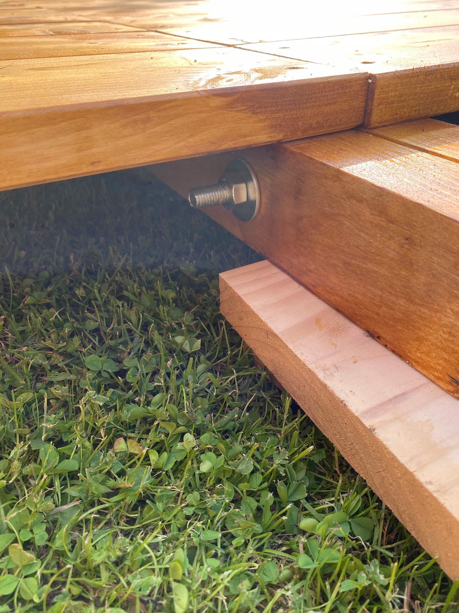 Існують прогалини між дошками, щоб забезпечити природну роботу деревини 1 мм - 2 мм. Гвинти оцинковані, завдяки цьому вони не роз'єднуються.