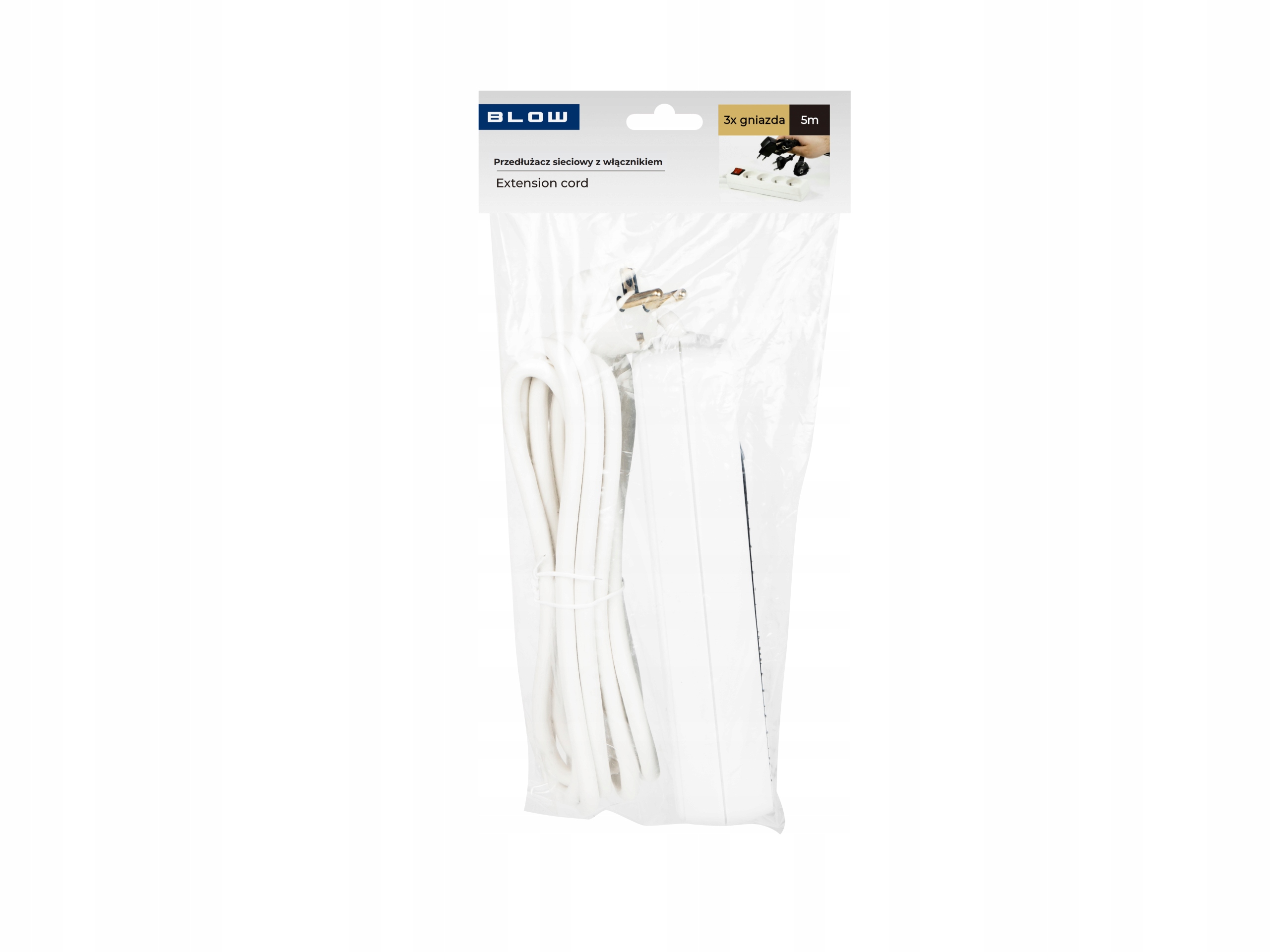 Подовжувач BLOW білий на три гнізда, призначений для домашнього використання. Подовжувач дозволяє підключати пристрої, які знаходяться далеко від електричної розетки. З одного боку виріб має три розетки, розвернуті під кутом, і вимикач, а з іншого — одинарну кутову вилку.