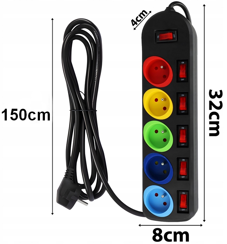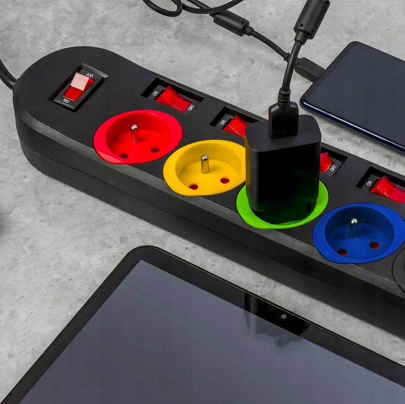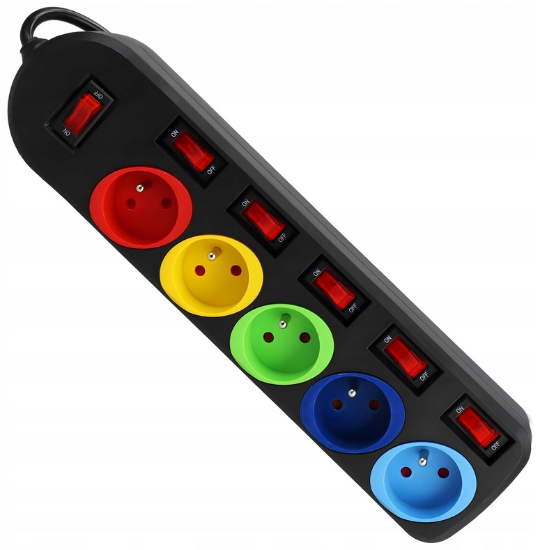КОЛЬОРОВІ РОЗЕТКИ / ВИМИКАЧІ ДЛЯ КОЖНОЇ РОЗЕТКИ / КОЖНОГО ТИПУ ВИЛКИ / ДОВЖИНА КАБЕЛЮ - 1,5 М / ПРОТИНАПРУГА / ЗАЗЕМЛЕННЯ / КЛАС ГЕРЦІЙНОСТІ - IP20 / ЗАХИСТ ДІТЕЙ