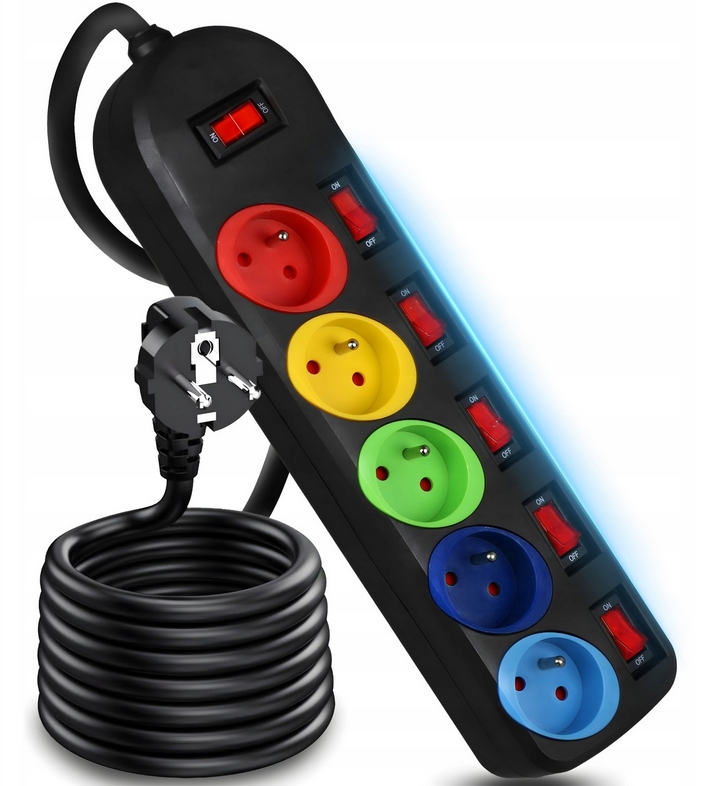Кабель-подовжувач живлення з 5 кольоровими розетками дозволяє підключати пристрої, розташовані подалі від електричної розетки. Він має розетки, повернуті під кутом, вбудований вимикач і кутову вилку.