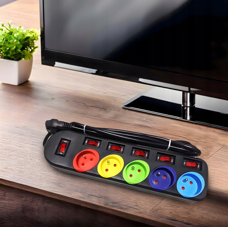Подовжувач із 5 кольоровими розетками дозволяє підключати пристрої далеко від електричної розетки, пропонуючи максимальну потужність 3500 Вт