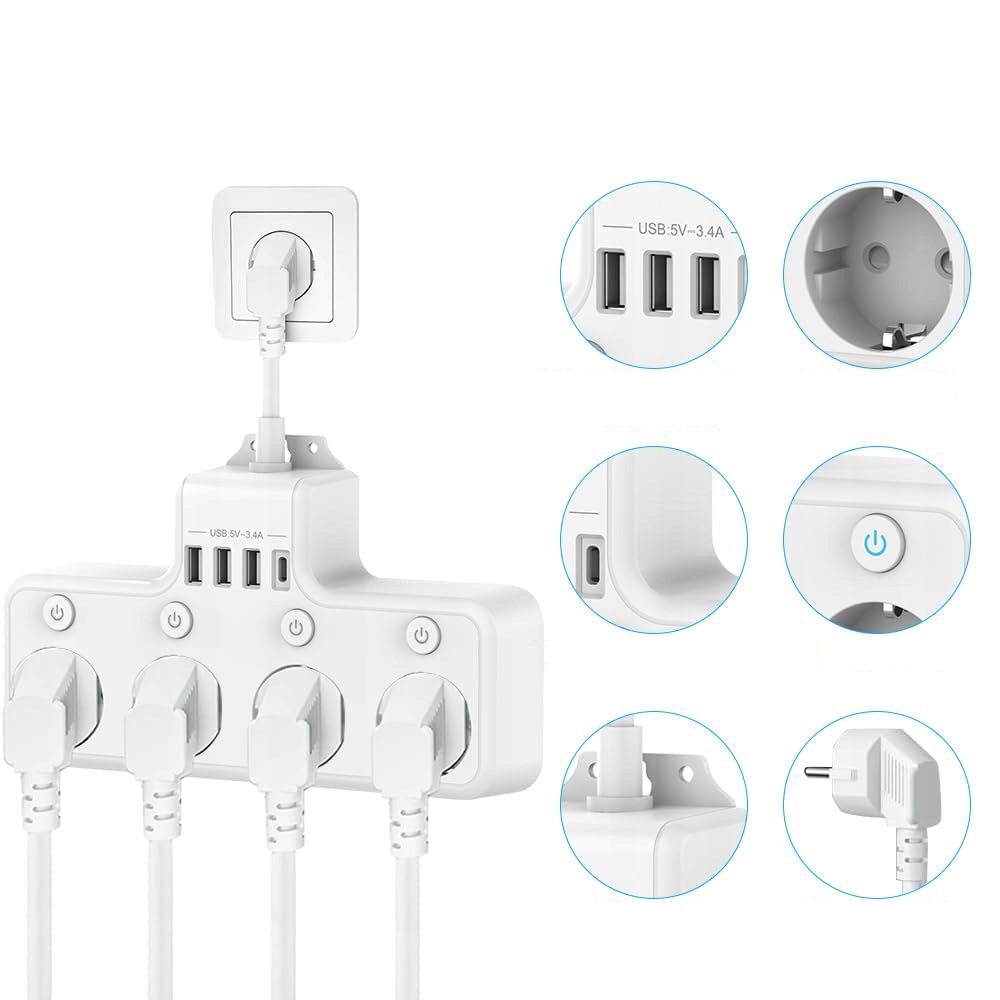 -📍📍Оснащений 3 портами USB A та 1 портом USB типу C (5 В/3,4 А),дозволяє легко заряджати смартфони, планшети та інші USB-пристрої. Може живити до 8 пристроїв одночасно.