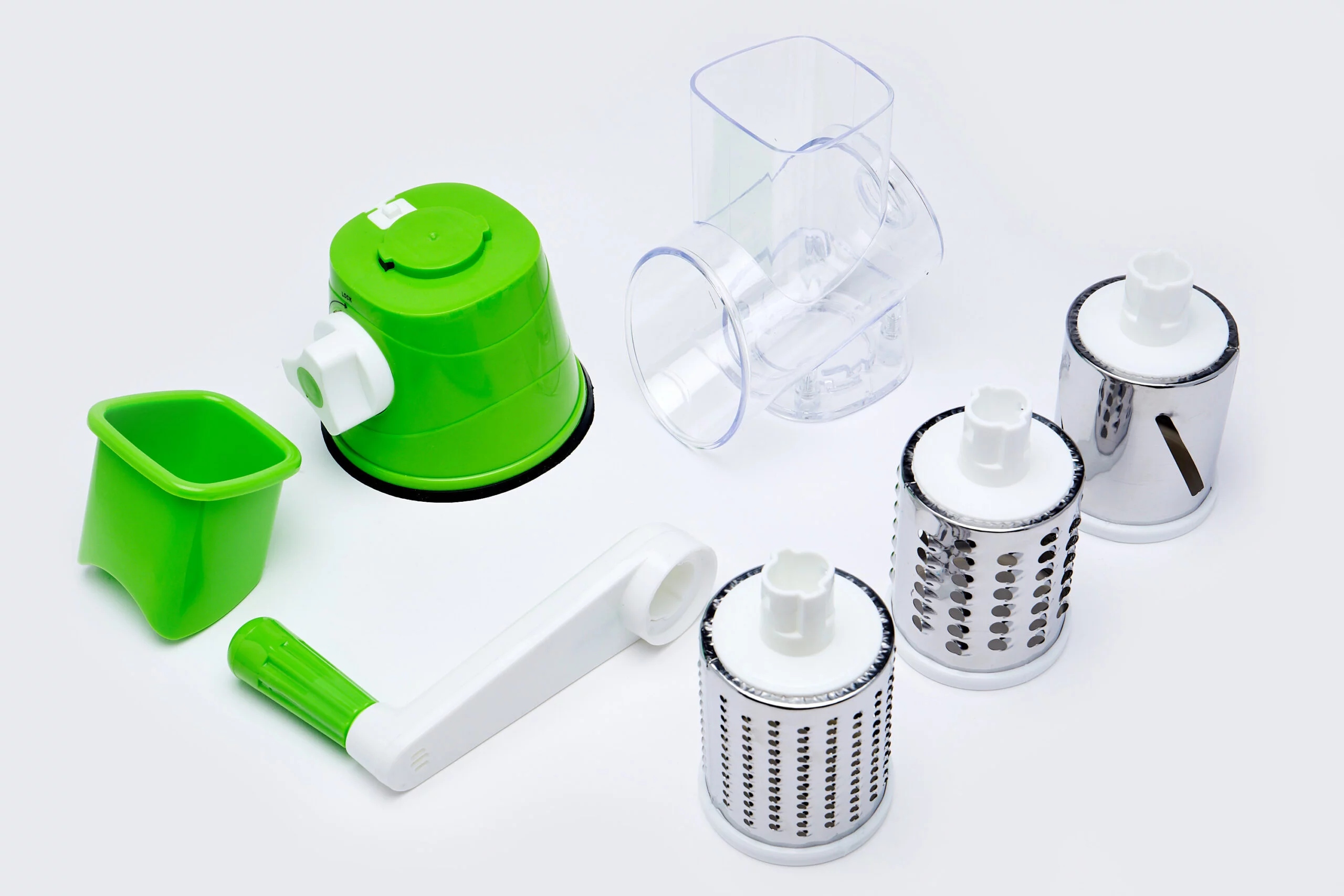 Барабанна багатофункціональна терка звисокоякісна нержавіюча сталь і пластик, оснащений 3 змінними лезами з нержавіючої сталі. Камера терки має нахил, завдяки чому натерті овочі легше випадають з барабана. В основі є присоска, яка стабілізує тертку.