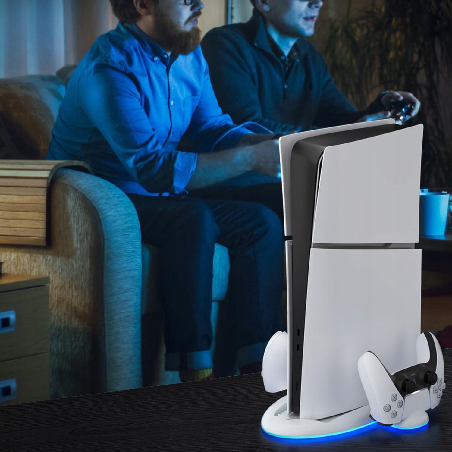 - ✅️З футуристичною естетикою космічного корабля наша зарядна станція — це щось більше ніж просто зарядний пристрій – він охолоджує вашу консоль, забезпечує яскраве RGBосвітлення та ідеально інтегрується зPS5 Slim.