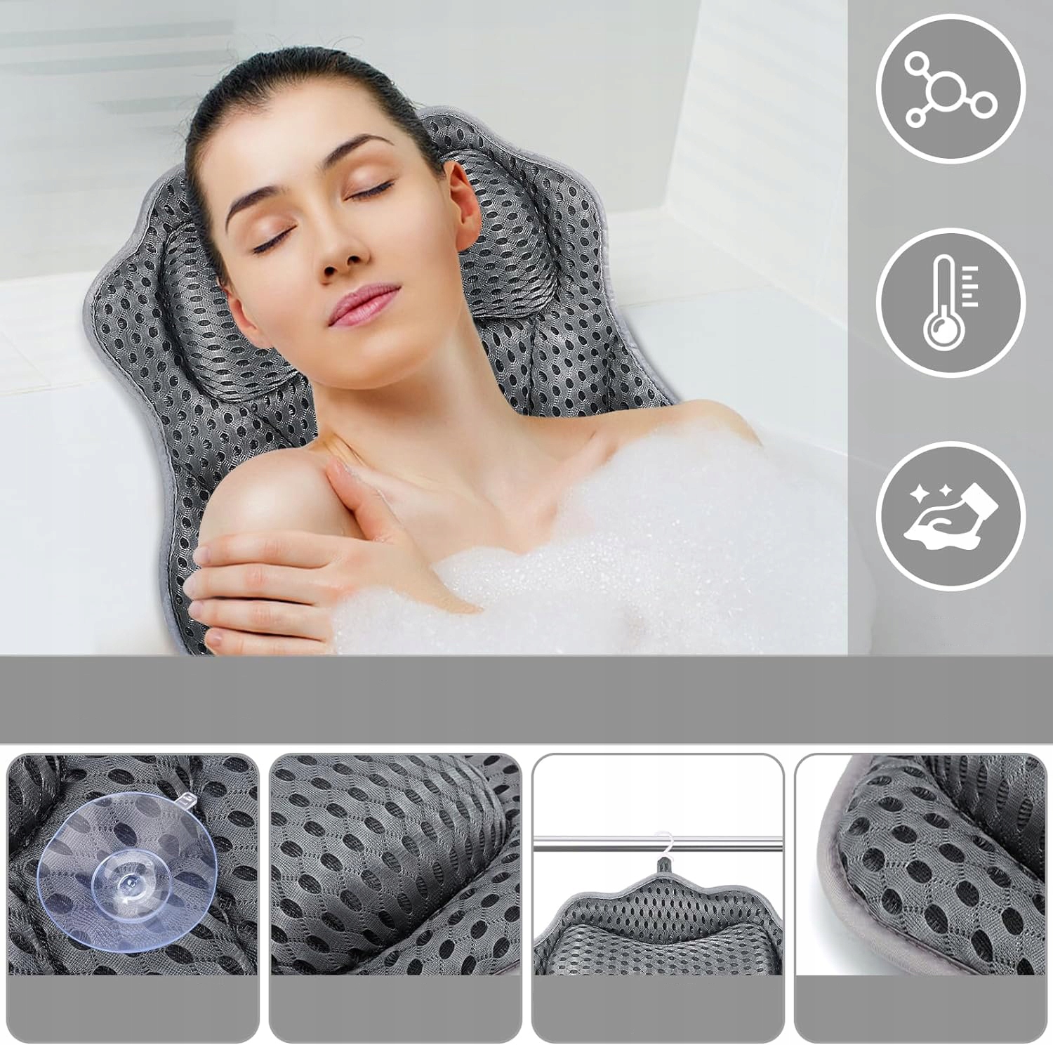 ПОДУШКА ДЛЯ ВАННИ З ПРИСОСКАМИ - ДИХАЮЧА 4D AIR MESH, СІРА