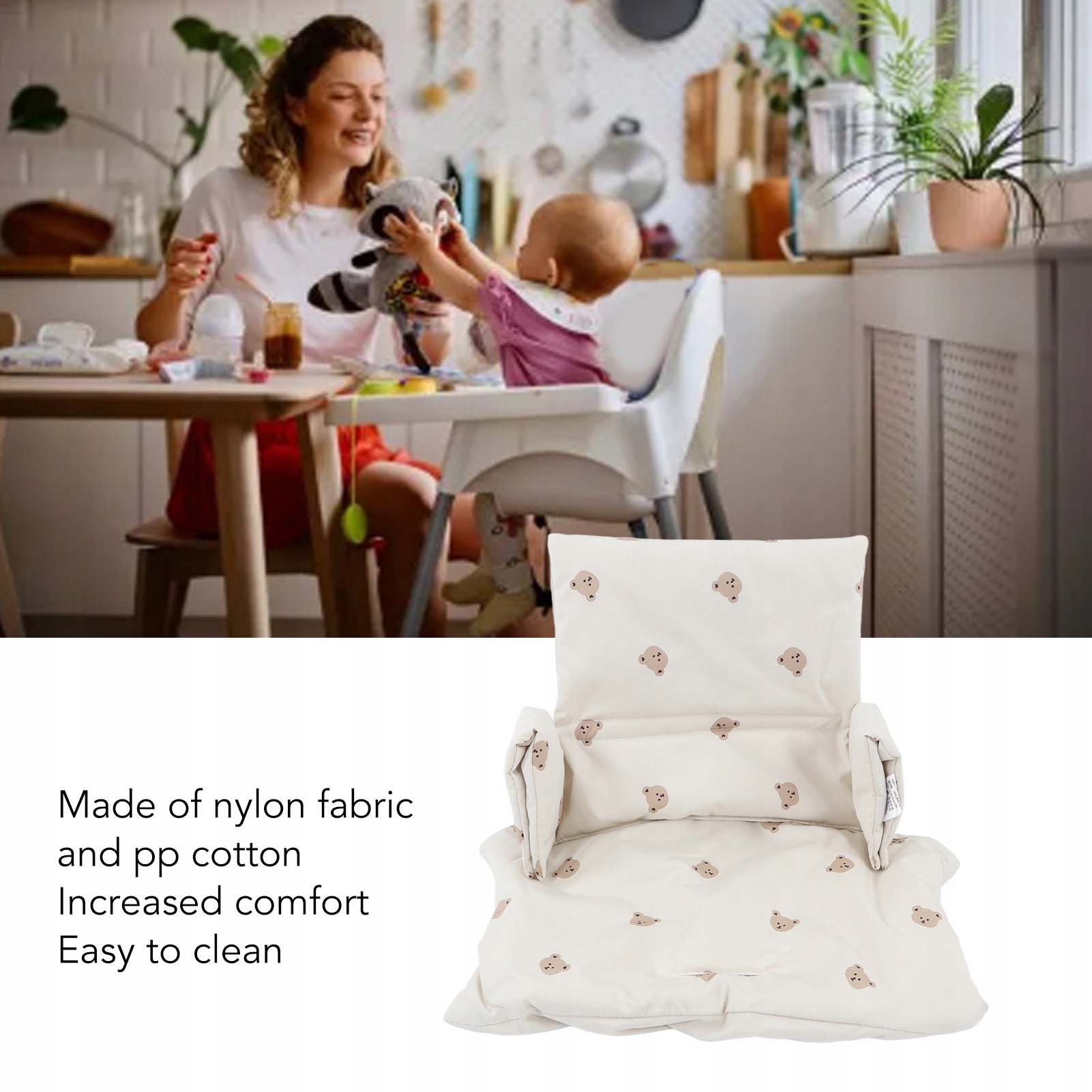 5. Нейлонова тканина: подушка виготовлена з нейлонової тканини та поліпропіленової бавовни, забезпечуючи зручне, легке в чищенні та міцне сидіння для вашої дитини за обіднім столом.