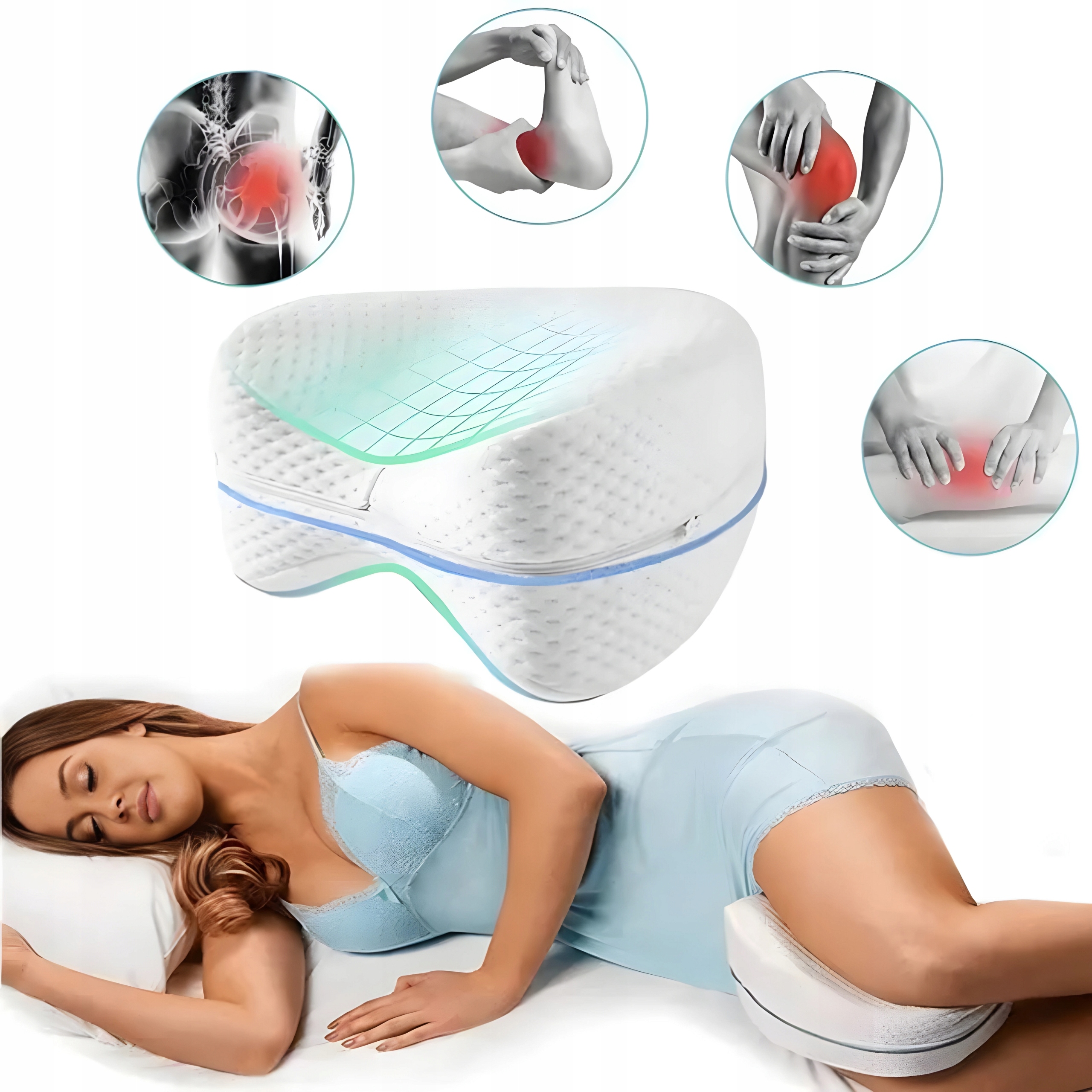 Ортопедична наколінна подушка допомагає зняти дискомфорт у спині, стегнах, ногах, колінах та симптоми ішіасу. Його ергономічна рельєфна форма ідеально адаптується до природних вигинів тіла, підтримуючи правильне положення ніг під час сну.
