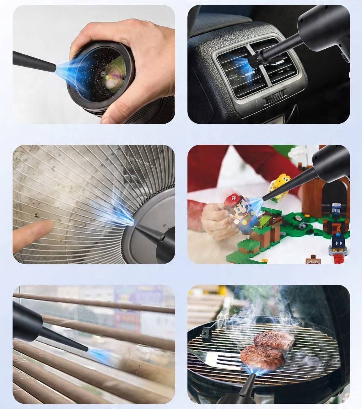 Висока потужність повітродувки дозволяє їй справлятися навіть із найскладнішими завданнями. Будь то комп’ютер, клавіатура, фотоапарат, іграшки, автомобіль, кондиціонер чи навіть розпалювання гриля, це обладнання забезпечить вас достатньою потужністю, щоб ретельно очистити будь-яку поверхню.