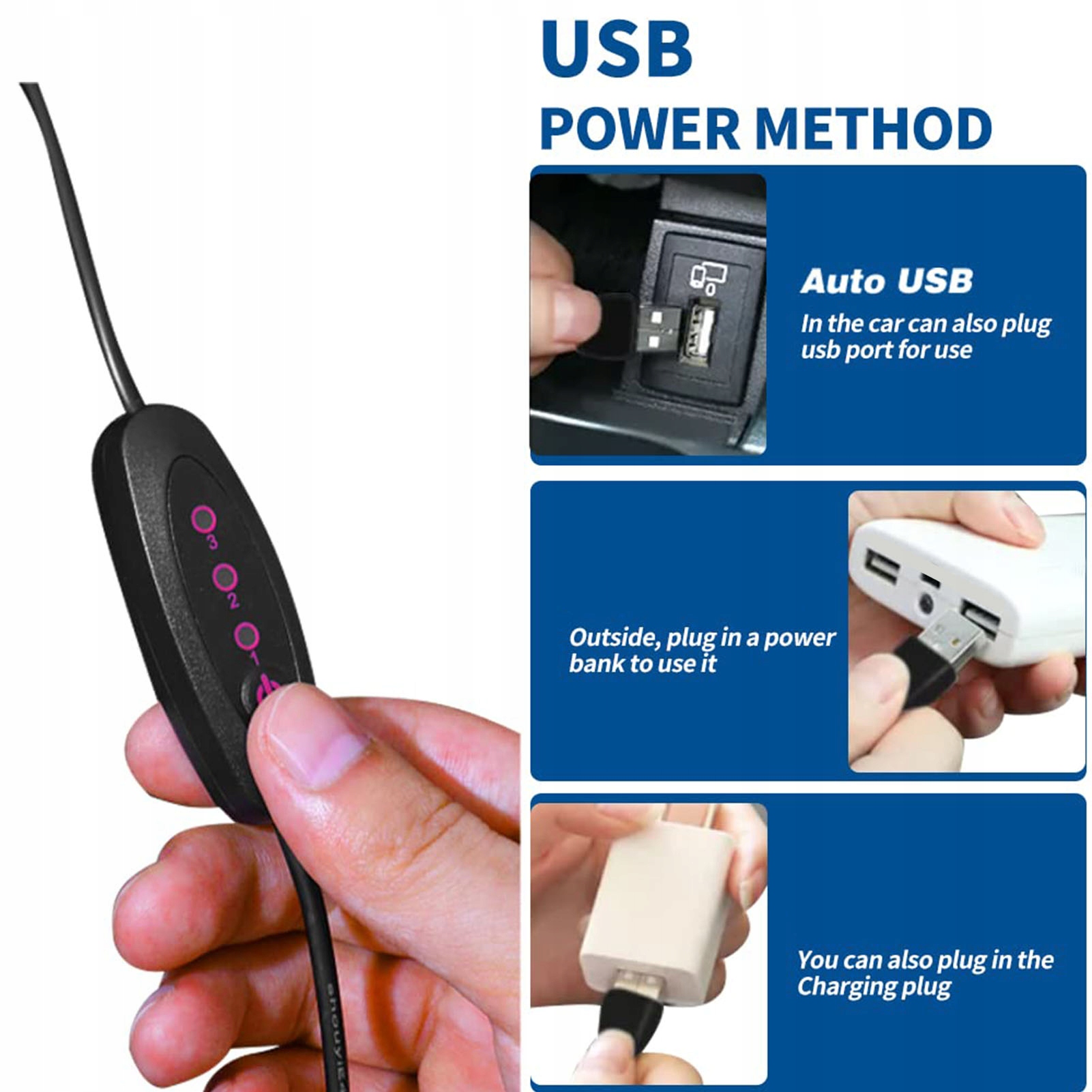 3. USB-порт: килимок для коляски можна живити від більшості пристроїв із живленням від USB, таких як настільні комп’ютери, акумулятори, USB-зарядні пристрої, автомобільні адаптери тощо. Безпечна напруга 5 В, 1 м комутаційного кабелю.