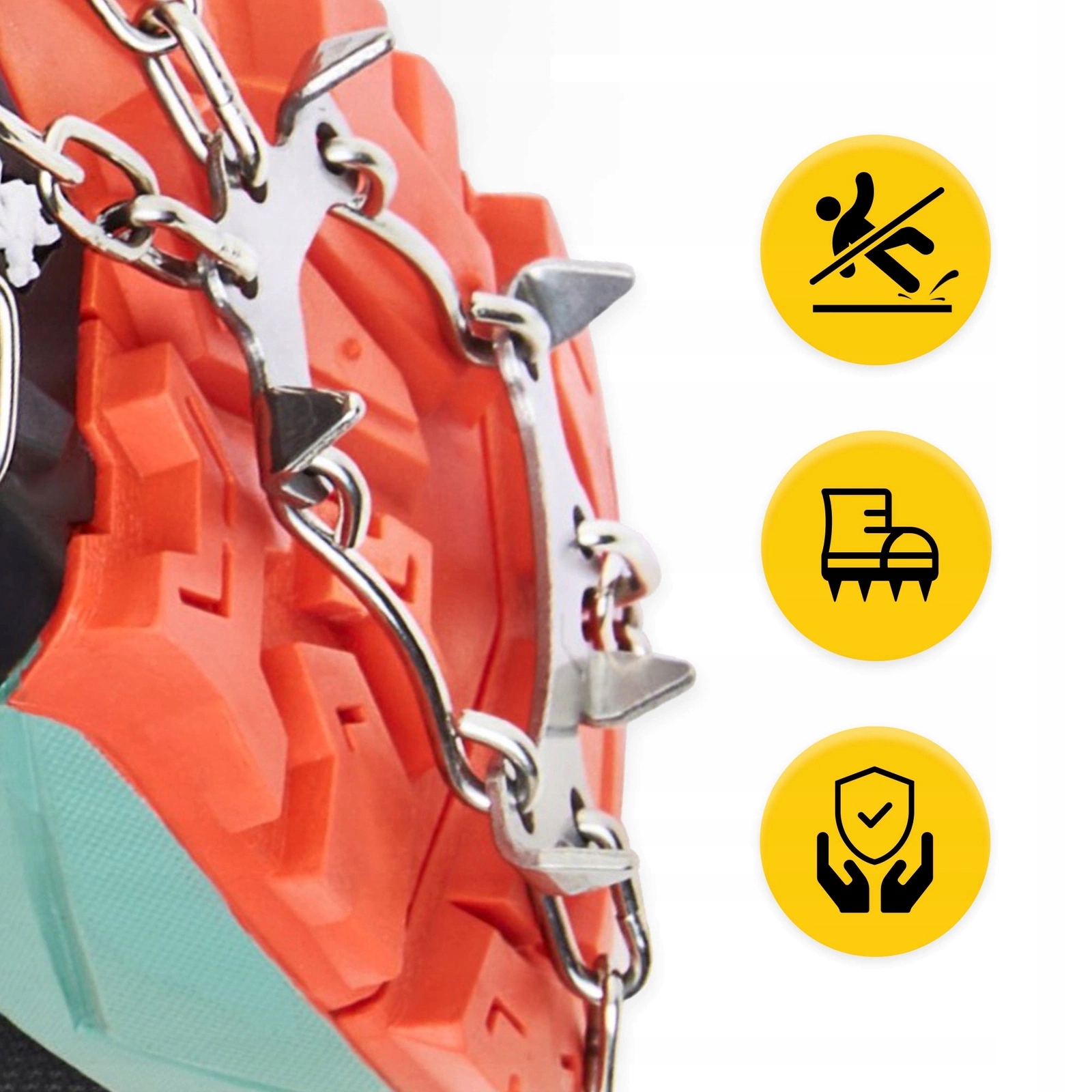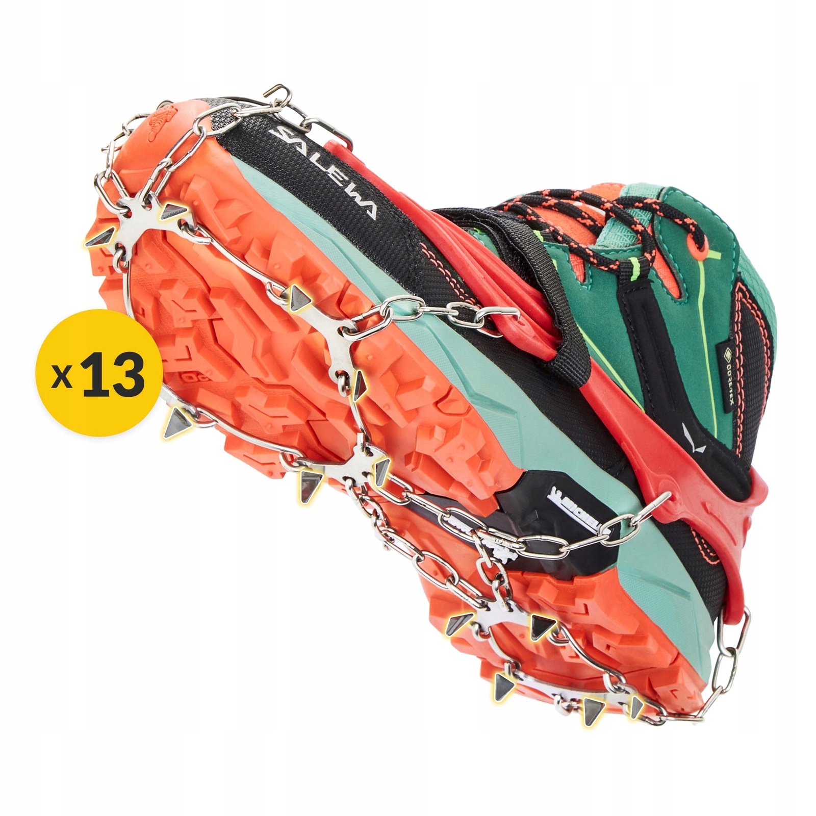 Зварні ланцюги з 13 зубами виготовлені з стійкої нержавіючої сталі. Міцні шипи ідеально підходять для сходження по гірських стежках. Вони забезпечують краще зчеплення зі слизькою поверхнею та захищають від випадкових падінь. Додатковою перевагою ручок для дитячого взуття є їх універсальний дизайн. Дозволяє підібрати розмір під різні типи трекінгового взуття. текстильні ремені з липучками забезпечують краще розташування та надійне утримання ручок на ніжці. Після завершення дії витріть руки насухо серветкою, щоб зберегти їх у хорошому стані протягом багатьох сезонів.