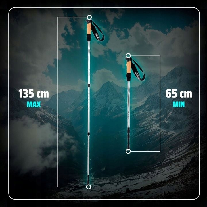 ◾ діапазон від 65 см до 135 см - полюси є телескопічними, що дозволяє легко регулювати довжину та адаптувати їх до висоти користувача, і тип місцевості, на яку ви подорожуєте.
