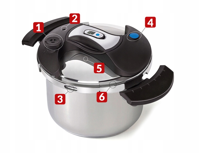 4. Індикатор тиску - показує поточний рівень тиску всередині судна, що полегшує регулювання відповідної потужності нагріву, а також інформує, коли ви можете безпечно відкрити кришку.