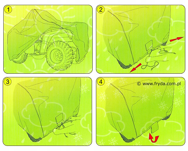 - Брезент кріпиться за допомогою надійного традиційного шнурка. з мотузкою навколо всього квадроцикла.