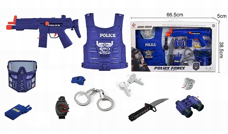 ✨У набір входить: жилет, маска, гвинтівка, наручники, ключі, свисток, рація, значок, бінокль, ніж, годинник.