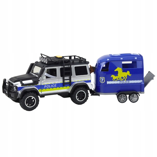 - Високоякісна поліцейська машина з конями - ідеальний набір для невеликих шанувальників уніформованих послуг та реалістичних розваг. Позашляховий транспортний засіб у чорно-синіх кольорах оснащений світлими та звуковими ефектами, що додає реалізму та забезпечує багато годин творчих розваг. Двері відкриття дозволяють ще більше захоплювати забаву, а знімний трейлер з фігурою коня дає додаткові можливості для створення різних сценаріїв. Набір підтримує розвиток уяви, ручних навичок та вчить логічного мислення. Комплект включає в себе польову поліцейську машину, коні для транспортування коней, статуетка коня та тестові батареї AG13. Продукт виготовлений з довговічного пластику і характеризується ретельною продуктивністю найменшими деталями. Це дивовижна пропозиція, яка порадує кожного маленького ентузіаста офіційних транспортних засобів та реалістичних розваг. Завдяки цьому наборі діти зможуть зіграти роль поліцейських та грати захоплюючу офіційну діяльність.