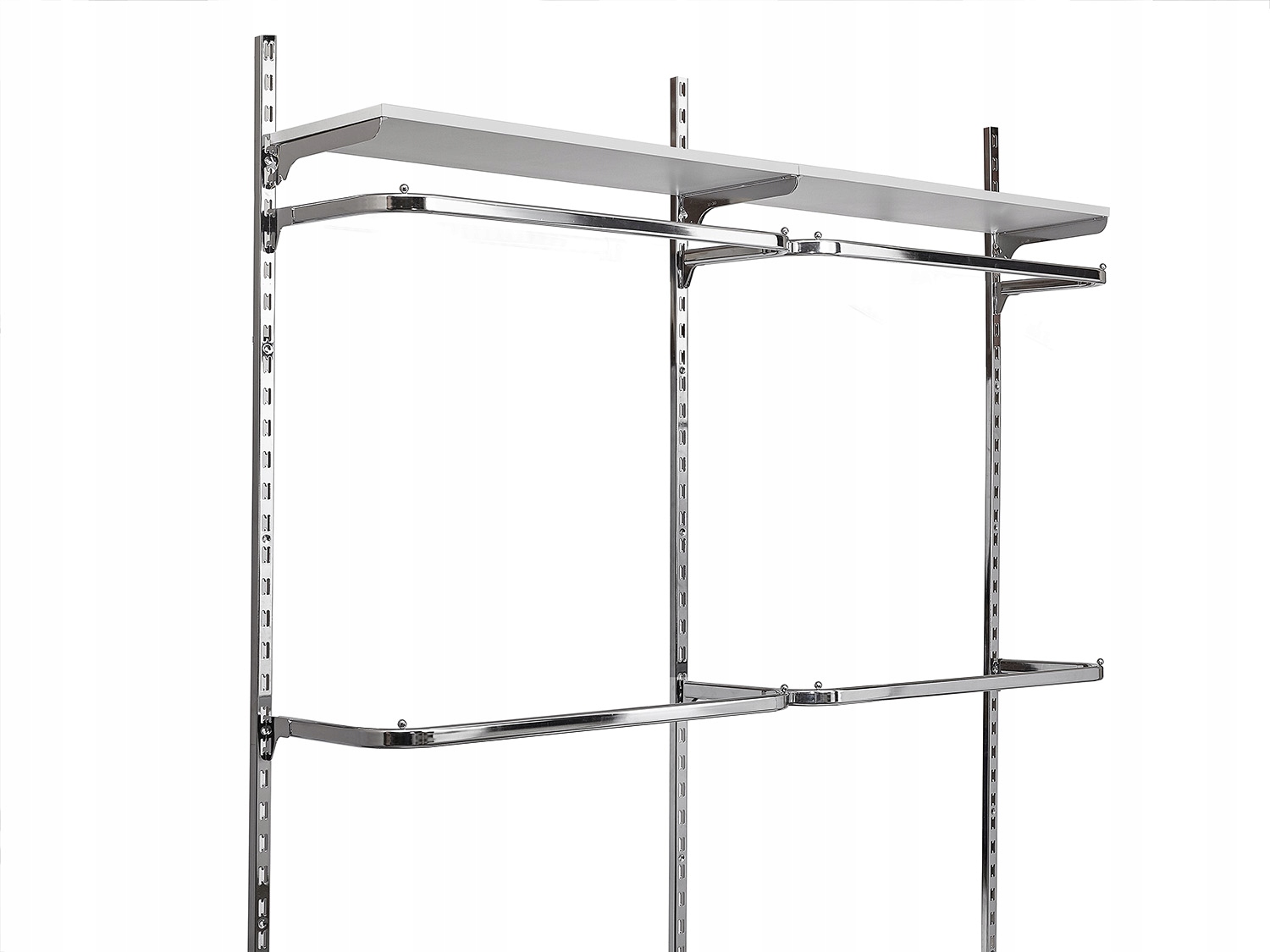 Опис: Двохмодульна шафа - це функціональний предмет меблів для використання в магазинах одягу та домашніх гардеробах. В основі конструкції лежить система стінових профілів. Розташування вішалок на рейках можна довільно конфігурувати. Великою перевагою цієї системи є її універсальність - техніку можна замінити на інші елементи (полиці, вішалки та ін.) в залежності від виникаючих потреб. Рейки, прикріплені до стіни, створюють міцну основу для вішалок. Меблі легко збираються. Можна розширити додатковими модулями.