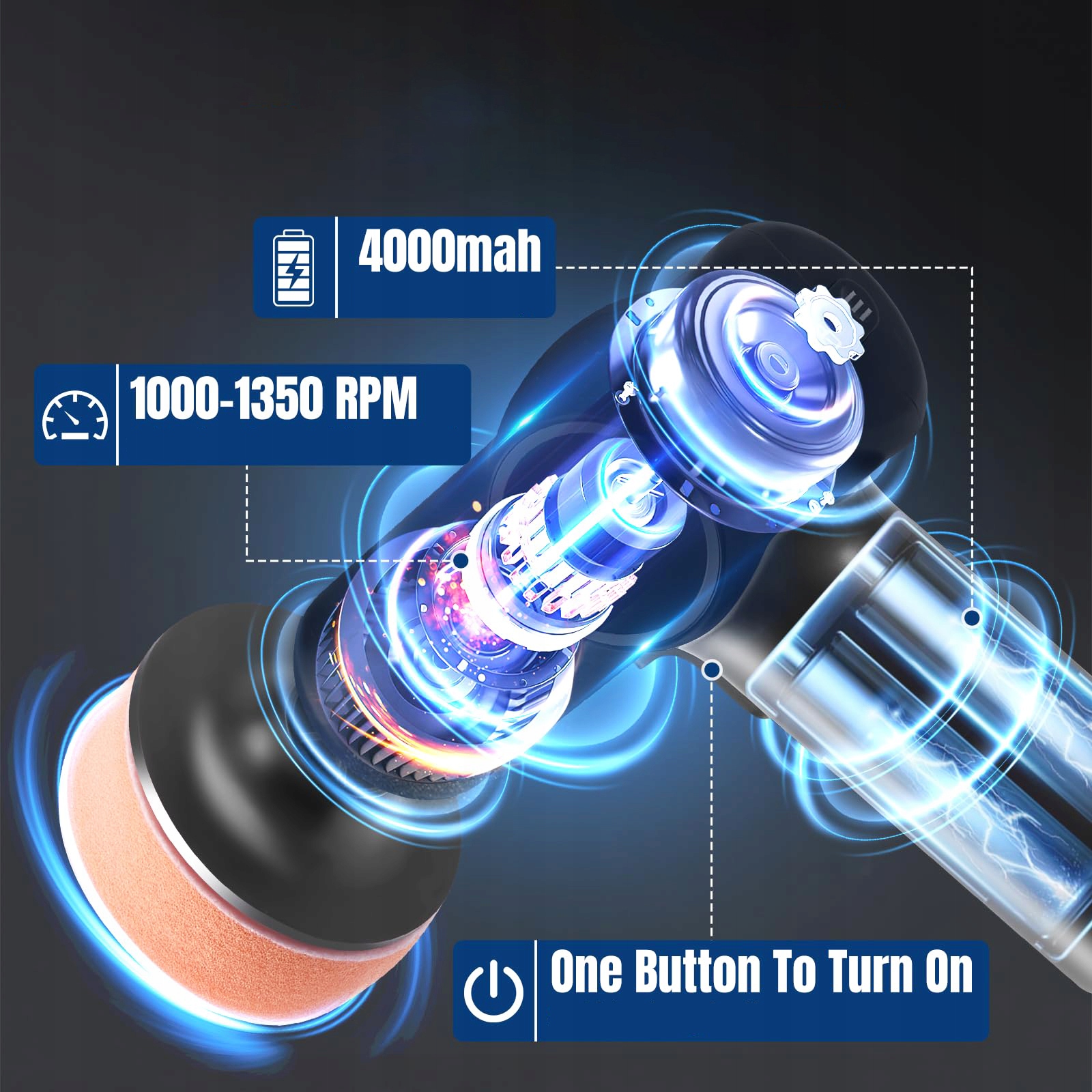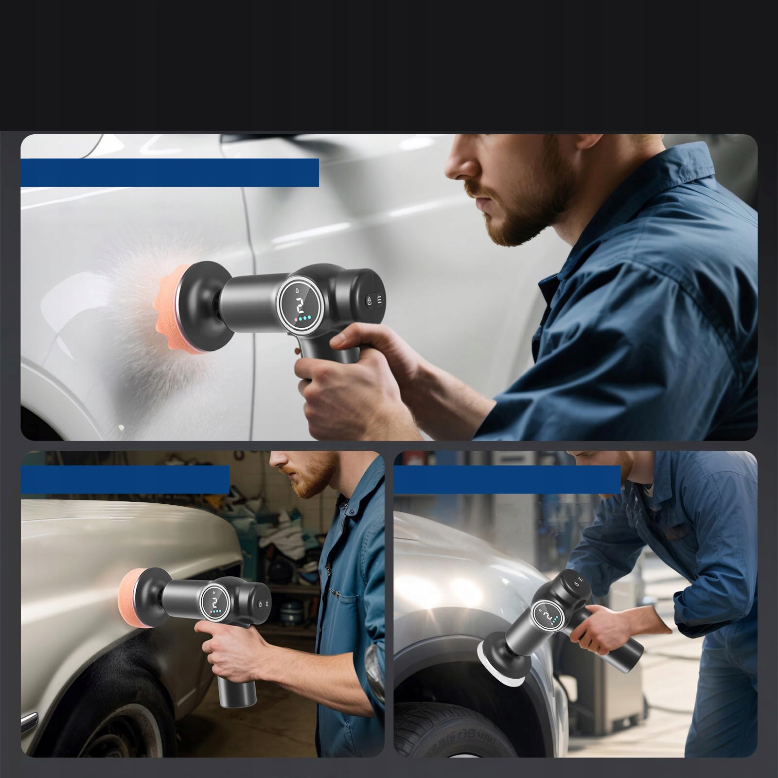 Мініатюрний автомобільний полірувальник, оснащений акумулятором 4000 мАг із зарядним портом USB-C. Чотириступеневий індикатор заряду (25%/50%/75%/100%) дозволяє контролювати рівень заряду. Ідеально підходить для: