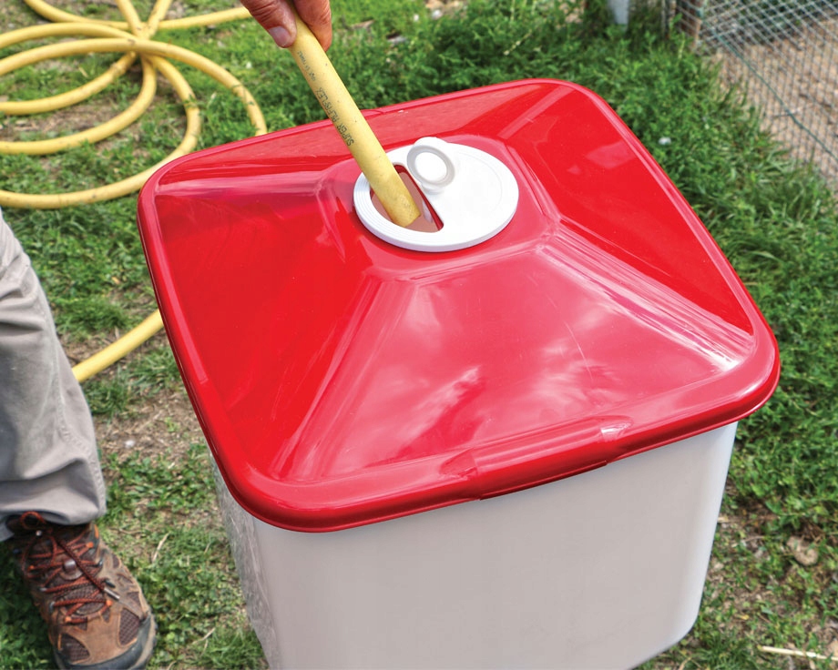 - ємності об'ємом 50 літрів з кришкою, яка захищає від потрапляння всередину комах і бруду, верхня кришка також дозволяє вільно додавати воду в поїлку за допомогою садового шланга, ніжок і миски, з якої тварини беруть воду. Чаша розташована на висоті 13,5 см, тому вода забруднюється не так швидко.