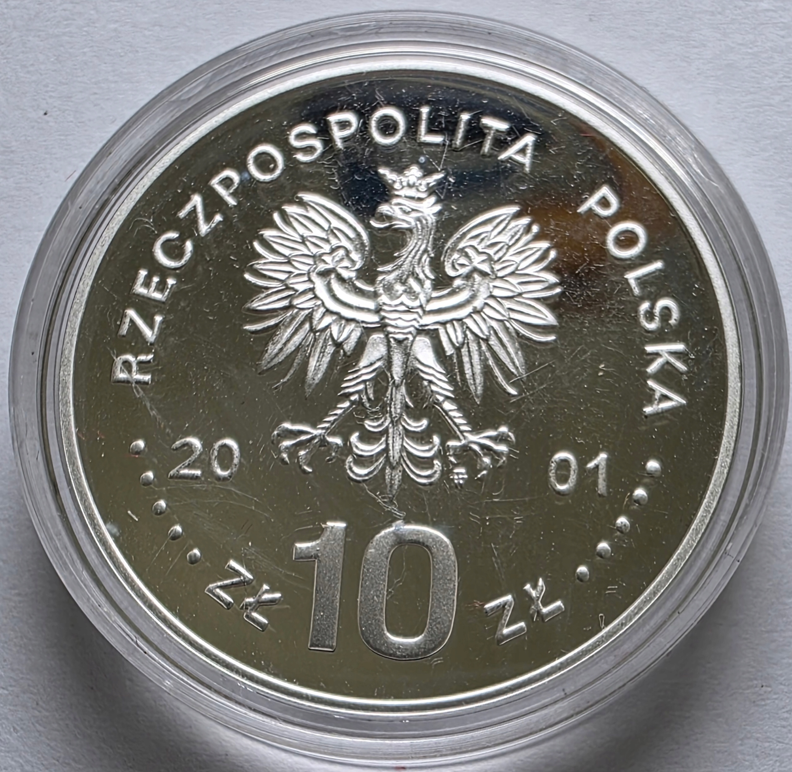 Аверс: Орел у короні, номінал 10 злотих, напис «Rzeczpospolita Polska» 2001»