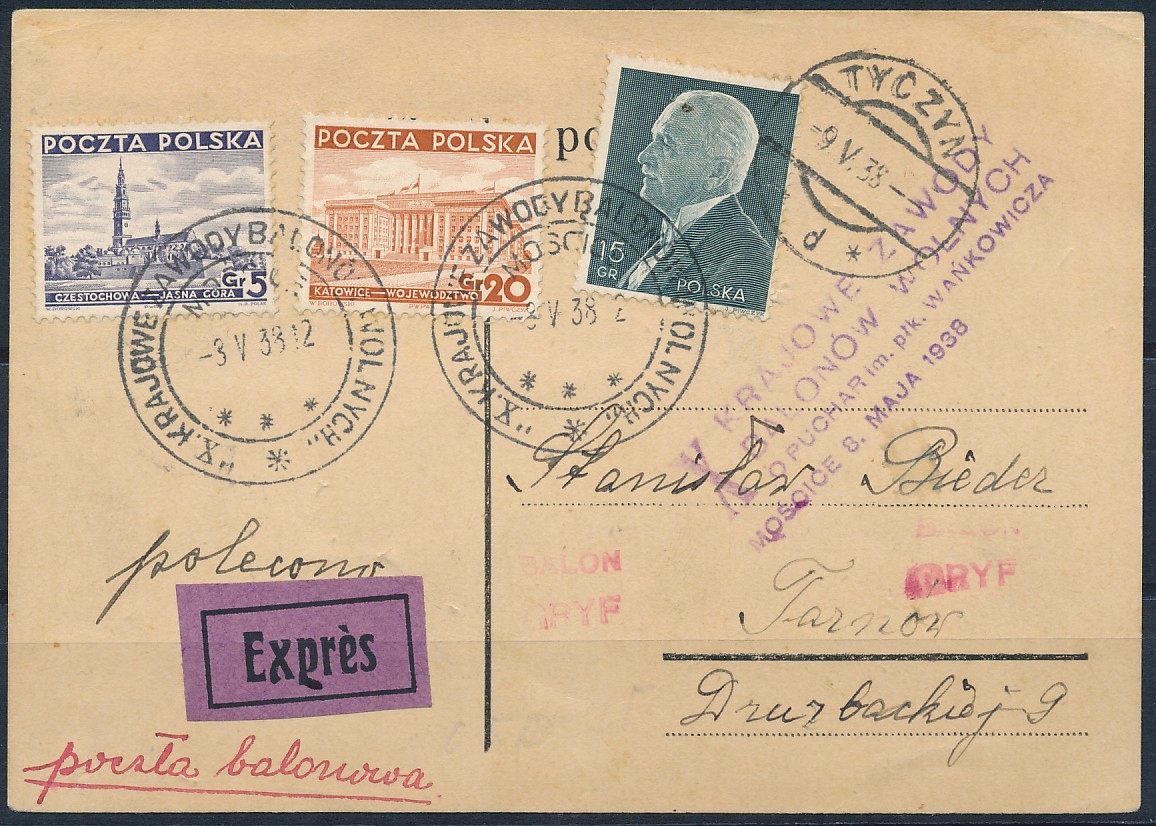 Польща 1938.V.03. Весь поштовий відправлений з повітряною кулею "Гриф" з нагоди 10 -го національного змагання з повітряної кулі на Кубок проходу.