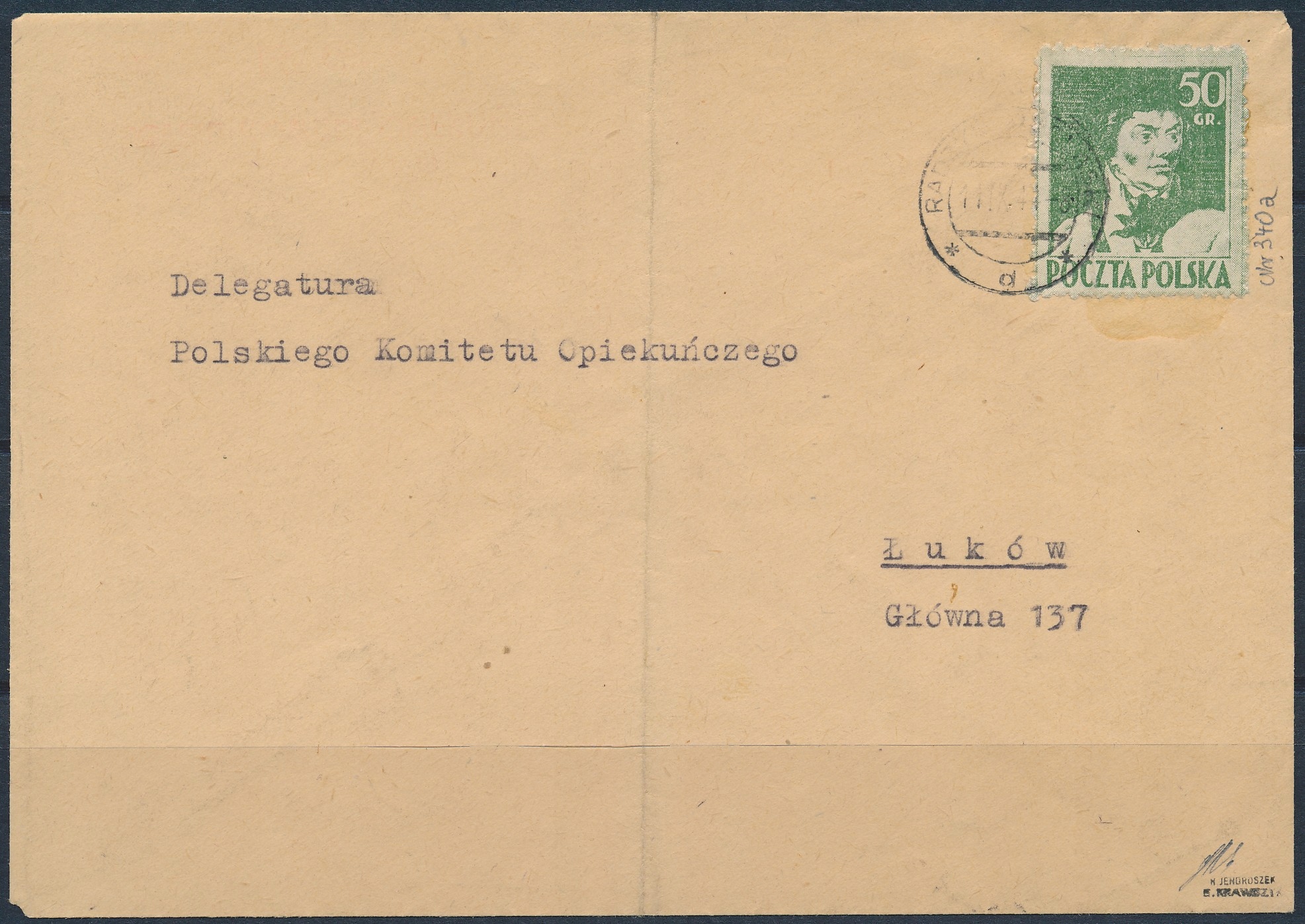 ПОЛЬЩА 1945.IX.11. Конверт, надісланий з Radzyń Podlaski до Польського Комітету Опіки в Лукове з одною маркою номіналом 50 грошей, надрукованою світло-зеленим кольором – перший тиждень використання марок серії Wodzowie в поштовому обігу.