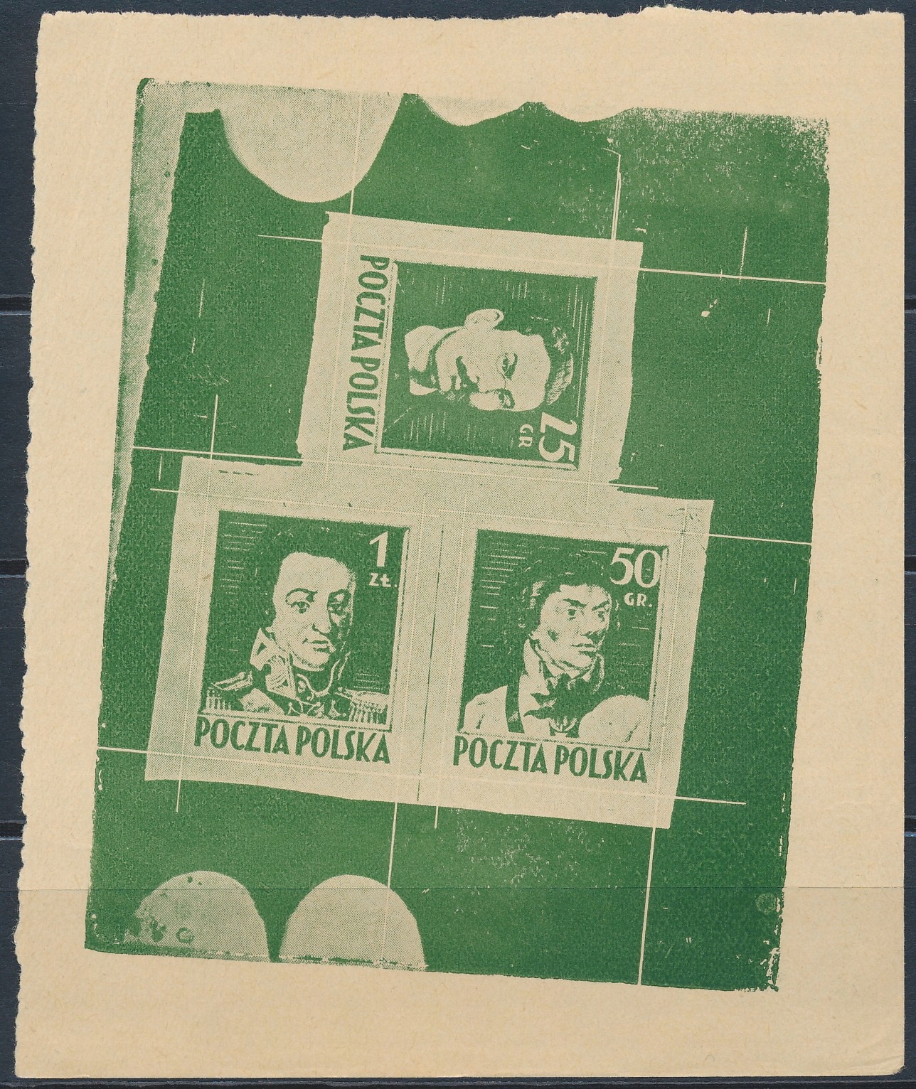 Польща 1944 р. Потрійні лідери, надруковані в зеленому кольорі на жовтуваному середньому папері у вигляді нехтуваного аркуша !!!