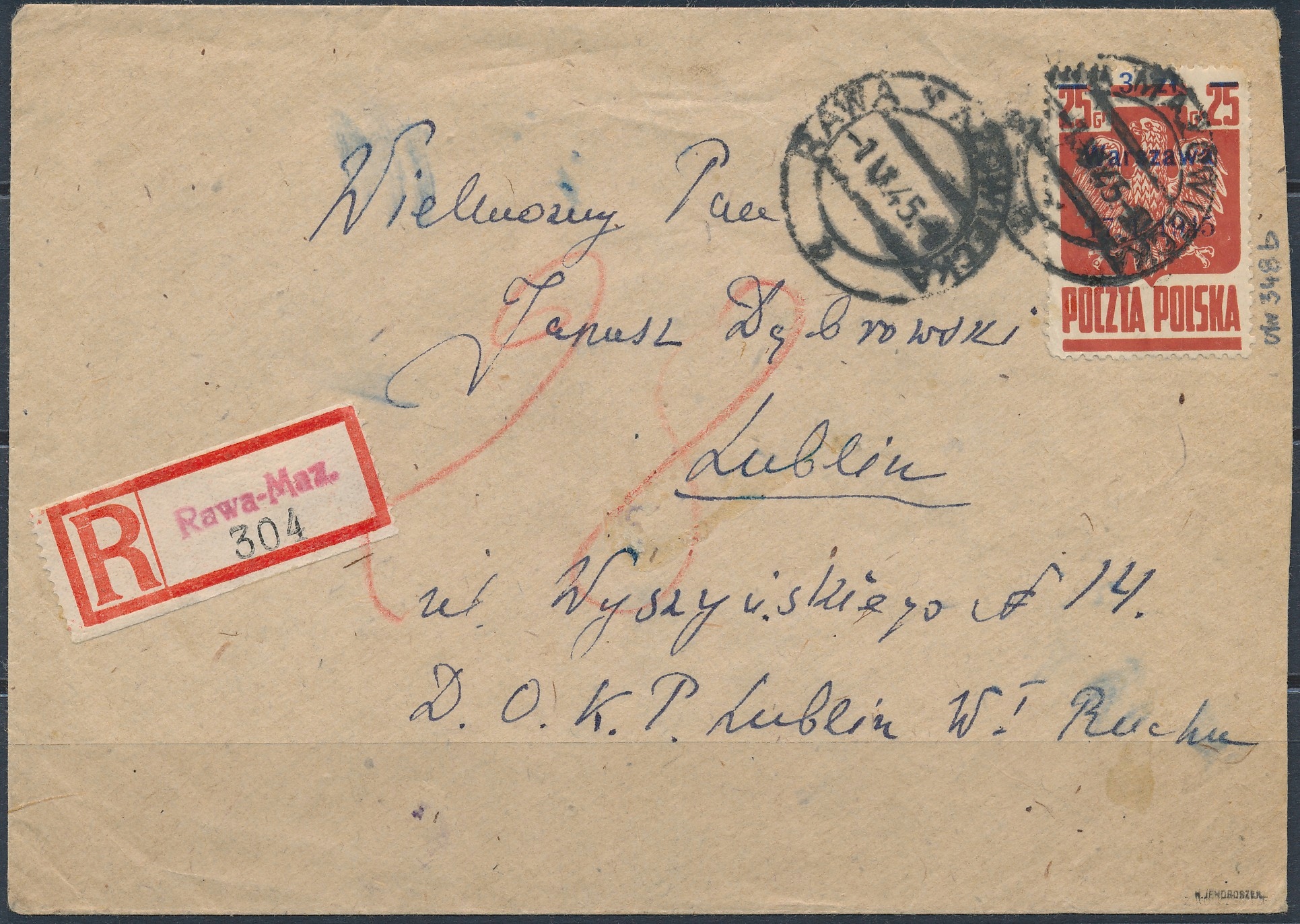 Польща 1945.V.01. Рекомендована конверт, надіслана з Rawa Mazowiecka до Любліна, заплатила за допомогою штампу Goznak визволення десяти міст Варшава, штамп, надрукований у коричневому кольорі. "Томат Варшава" !!!