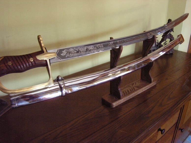 Це зброя зі злегка кругло загнутим клинком, увінчаним пером - подвійний клинок. Голову з одного боку прикрашає рослинний мотив, білий орел у короні та напис «БОГОМ ЧАСТИТЬ Батьківщину». Інша сторона леза гладка.