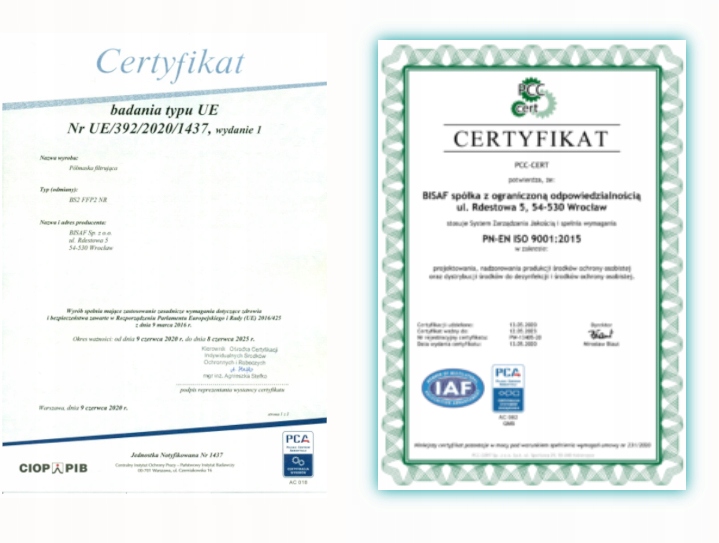 Він має сертифікат перевірки типу ЄС на відповідність стандарту EN 149:2001+A1:2009 – Засоби індивідуального захисту та є медичним пристроєм класу I відповідно до Директиви 93/ 42/EEC щодо медичних пристроїв.