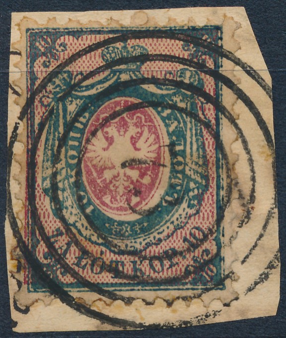 Королівство Польське 1860 р. Перша польська поштова марка «Jedynka», надрукована темними відтінками bb з помилками, з погашеним номером «73» Люблін на розрізі.