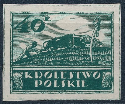 Королівство Польща 1917 р. Оранка 40 Pfennigs Необхідний дизайн перенесення, надрукований зеленим кольором на білому тонкому дерев’яному папері !!!